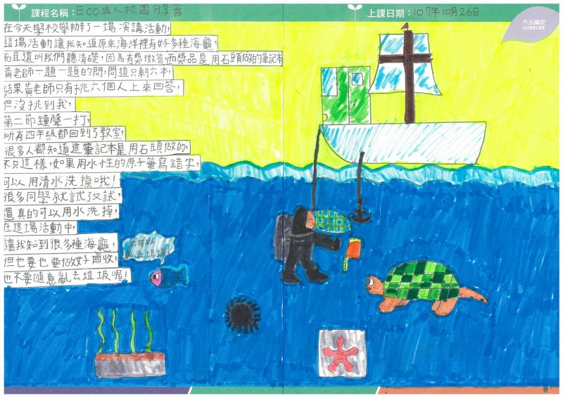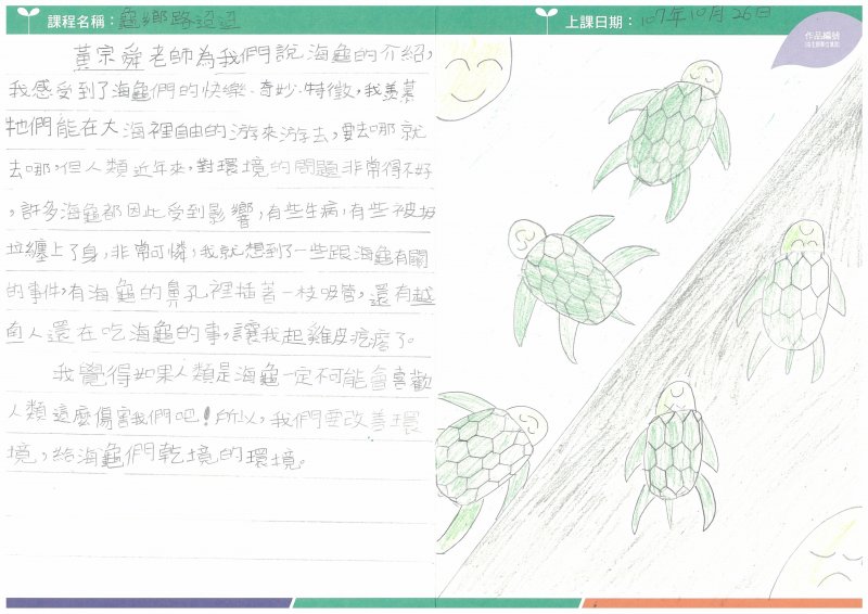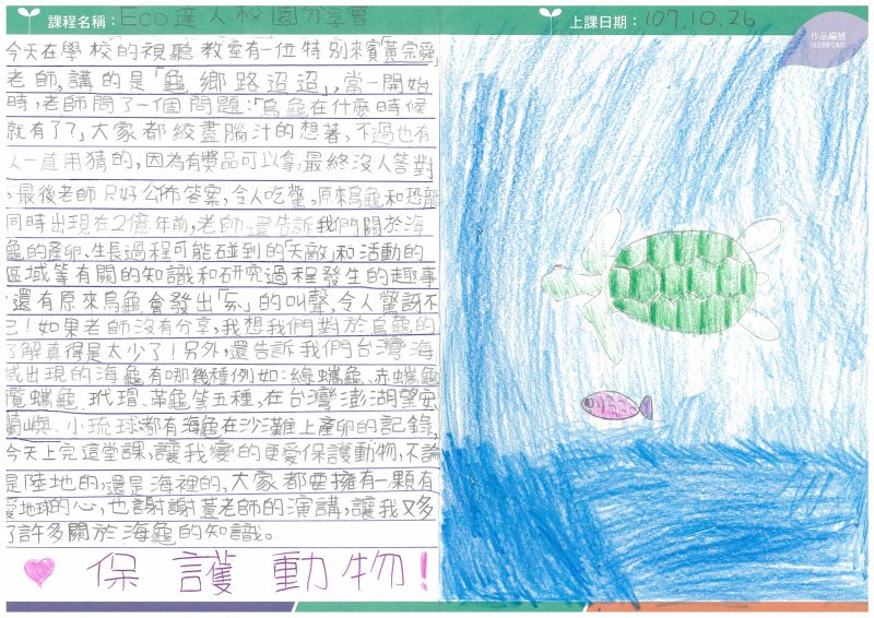 今天在和睦國小舉辦「歸鄉路迢迢」教學,請到來自台灣海洋環境廣協會且專門研究海龜的黃宗舜博士,為大家介紹海龜的生長與習性。黃老師透過有趣的親身體驗、與豐富的研究,讓四年級的孩子增廣見聞不少,除了知道全世界海龜只有7種,而台灣就發現了有5種;從會在台灣沙岸產卵的玳瑁和綠蠵龜、稀有的革龜中說明他們的生長方式與現在海洋汙染對他們生命威脅。深入淺出的說明方式,讓孩童感受到減塑愛地球的重要性。感謝財團法人電路板環境公益基金會辦理的「2018ECO達人校園分享會-環境教育課程」讓和睦的孩子有不同於課本的知識增長與體會。