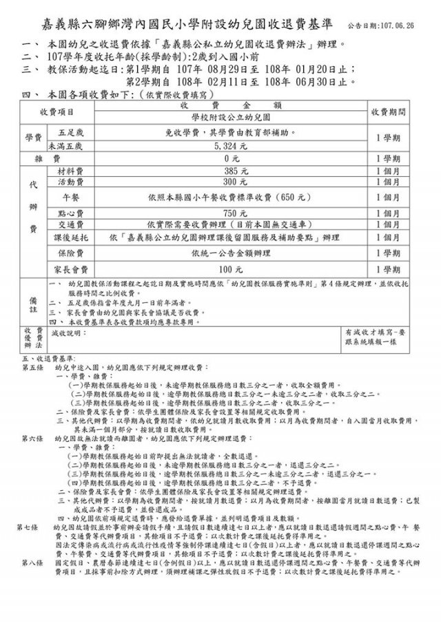 嘉義縣六腳鄉灣內國民小學附設幼兒園 107學年度收退費基準公告 107.06.26