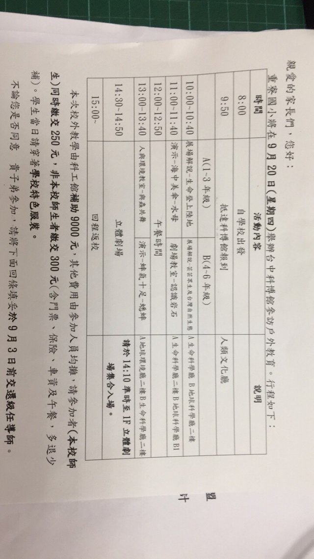 攜帶物品:水、手帕、衛生紙、、環保餐具(中午吃便當)、健保卡、少許零食。