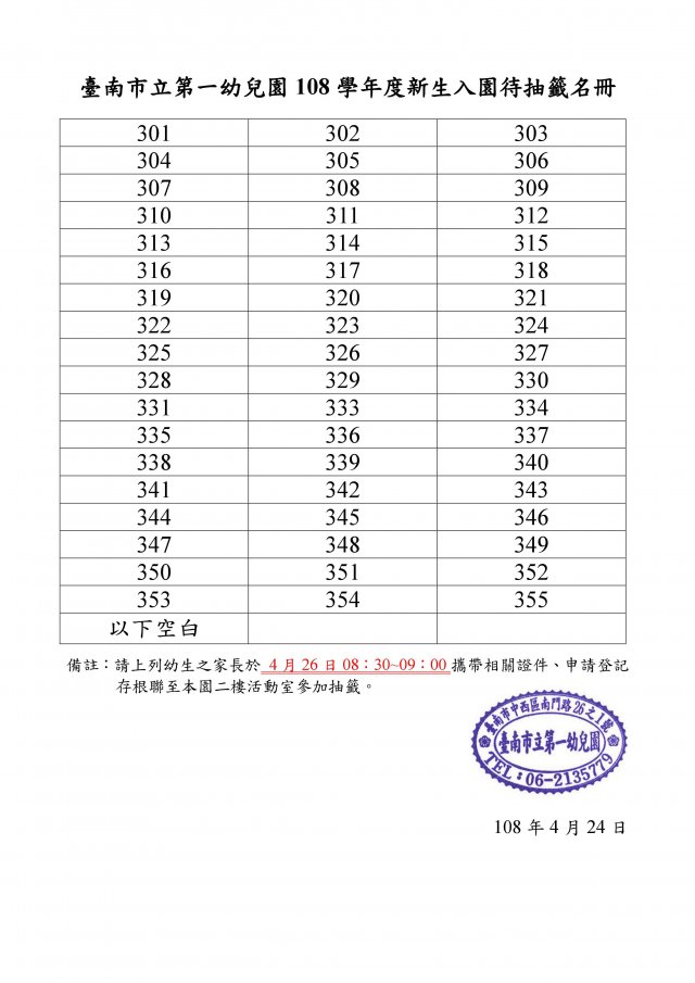 公告:臺南市立第一幼兒園108學年度「新生入園優先就讀名冊」與「新生入園待抽籤名冊」
