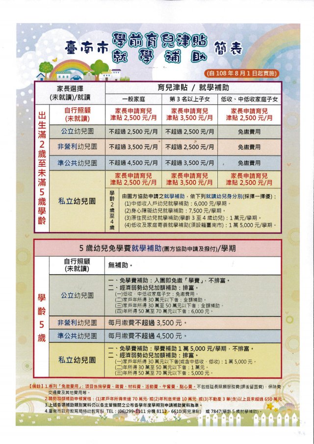 本市自108年8月1日起,家中有生理年齡滿2歲至當學年度9月1日前未滿5歲之我國籍幼兒,除配合中央設定排富條款外,補助額度每月2,500元,第三名以上子女每月再加發1,000元,請至幼兒戶籍所在地公所提出申請。