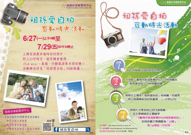 家庭教育中心辦理105年「祖孫愛自拍互動時光活動」,請踴躍參加。