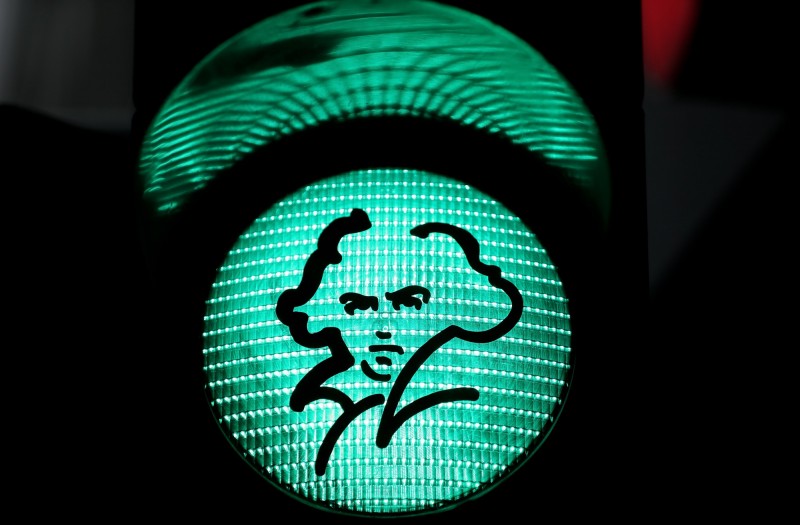 波恩街頭上,繪有貝多芬肖像的交通號誌燈。(歐新社)
