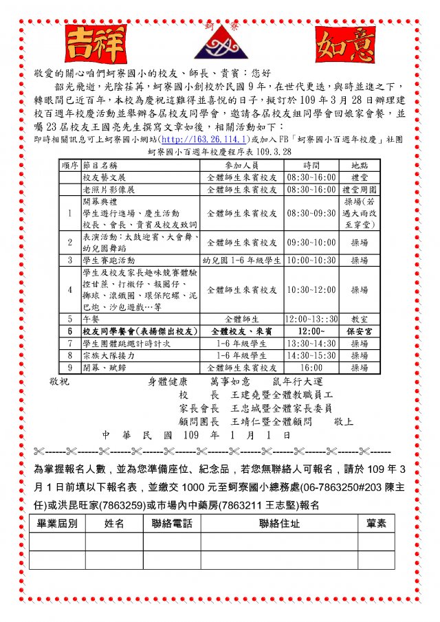 為掌握報名人數,並為您準備座位、紀念品,若您無聨絡人可報名,請於109年3月1日前填以下報名表,並繳交1000元至蚵寮國小總務處(06-7863250#203陳主任)或洪昆旺家(7863259)或市場內中藥房(7863211王志堅)報名