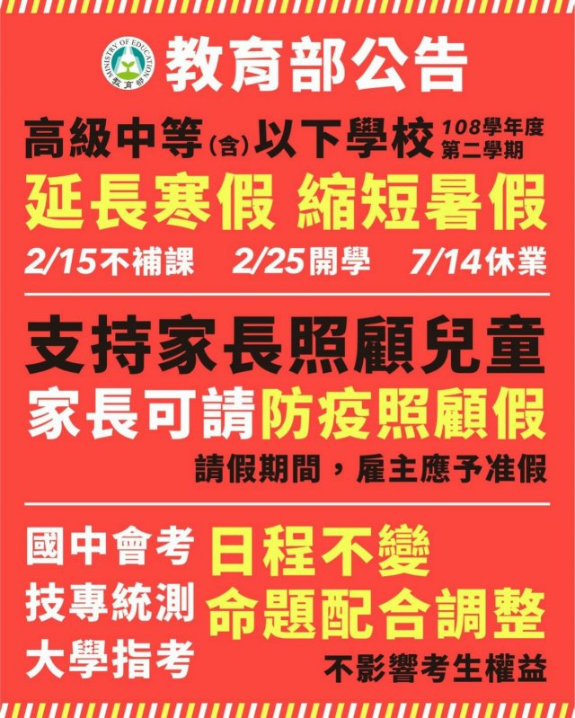因應政府武漢肺炎防疫政策,教育部公告高中以下學校108學年度第二學期寒假延長,開學日調整為109年2月25日。義方附幼108學年度第二學期開學日為109年2月25日(二)當日正常上課,寒假課後留園配合台北市教育局公告2/3日起暫停辦理受託。