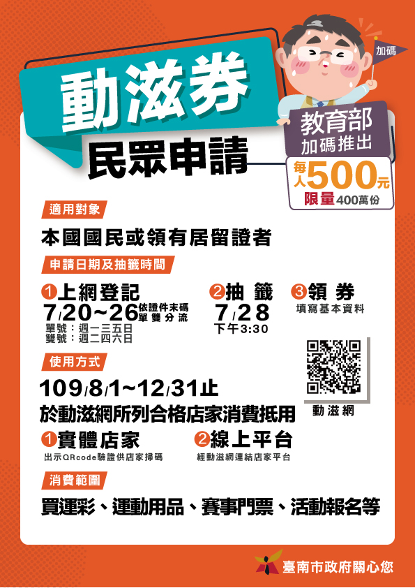 本國國民或持有居留證者於7月20日至7月26日至「動滋網」登錄基本資料參與抽籤,中籤者即可獲得500元電子抵用券,可使用於運動場館、觀賞運動賽事、參加體育活動、購買運動用品等相關運動產業。