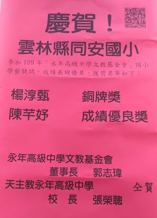 賀本校學生楊淳甄參加永年中學學藝競賽活動成績優異,榮獲銅牌獎。