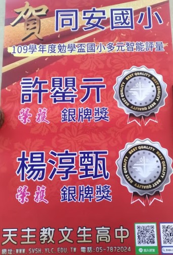 賀本校學生許罌亓、楊淳甄參加文生中學學藝競賽活動成績優異,榮獲銀牌獎。