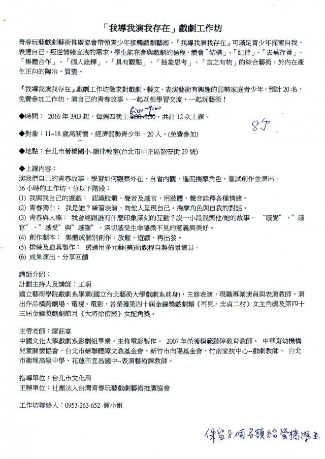 【好康快報】螢橋與戲劇工作坊合作,提供免費的戲劇課程「我導我演我存在」,從3/3開始每週四晚上6點到9點,共計12次,上課地點是螢橋國小校內,原本一期要4500元的課程現在完全免費喔!!!數量有限機會難得,有興趣的孩子們請在禮拜六以前來找我登記喔!!!或是直接找硯伃媽媽也可以!!!