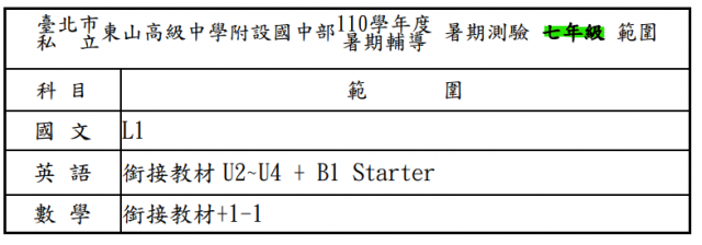 0825(三)暑測範圍 國文:銜接教材+翰林版 L1 夏夜+L1 夏夜的修辭(譬喻、排比、類疊、摹寫、轉化) 英文:銜接教材U2~U4+康軒版 B1 課本starter 數學:銜接教材+南一版 1-1 目前詢問任課老師的結果如以上資訊,若有變動會再做更改!請同學儘早準備!!