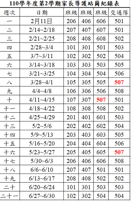 第2學期家長導護站崗表第10週-111年04月11日~04月15日