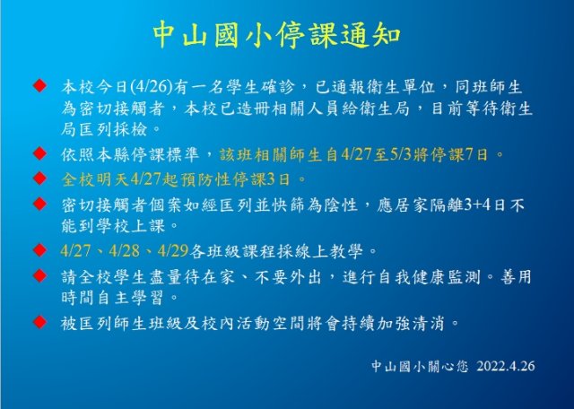 1110427-1110429全校預防性停課三天公告,後續事項老師會再聯絡家長。(點圖可放大)
