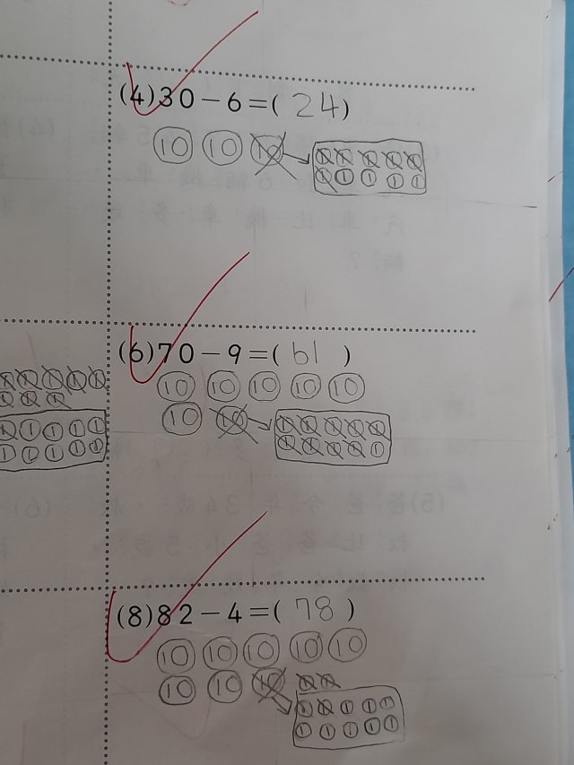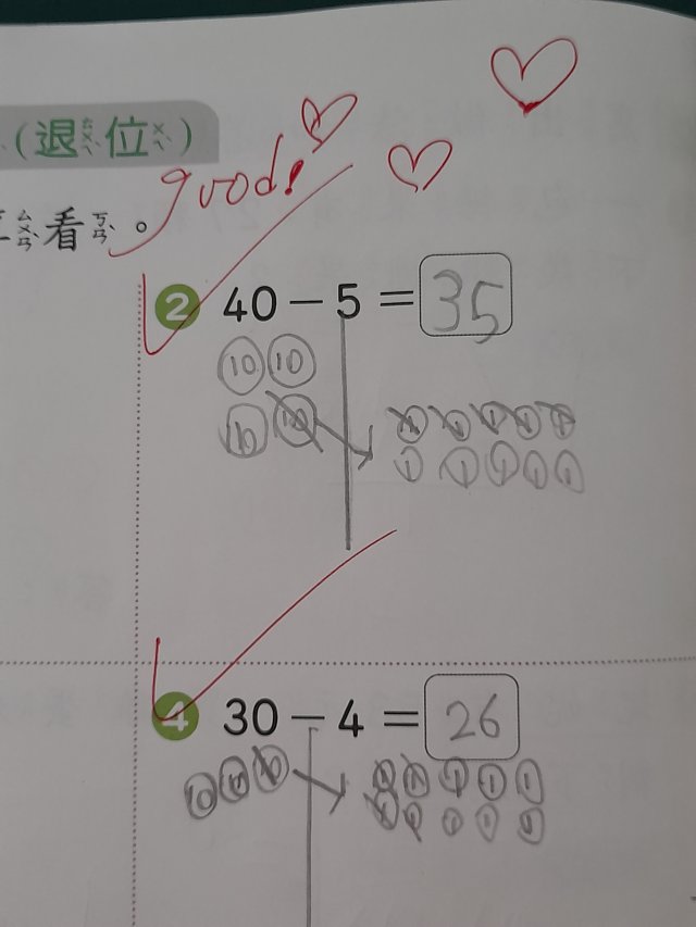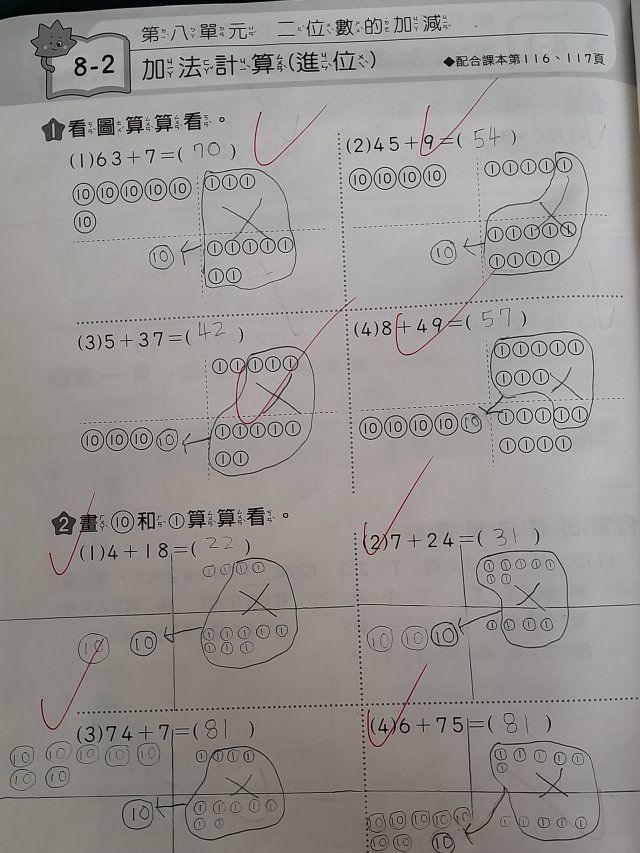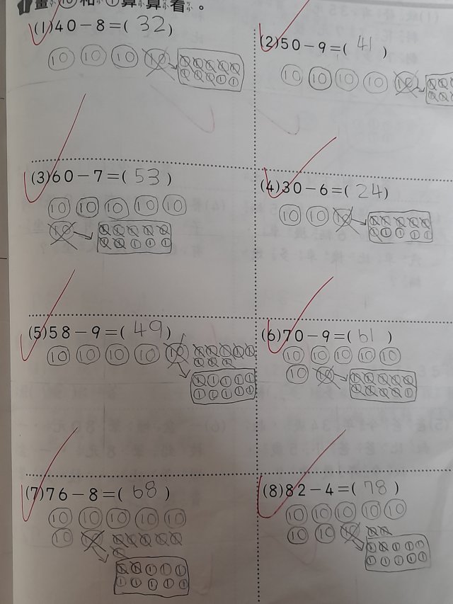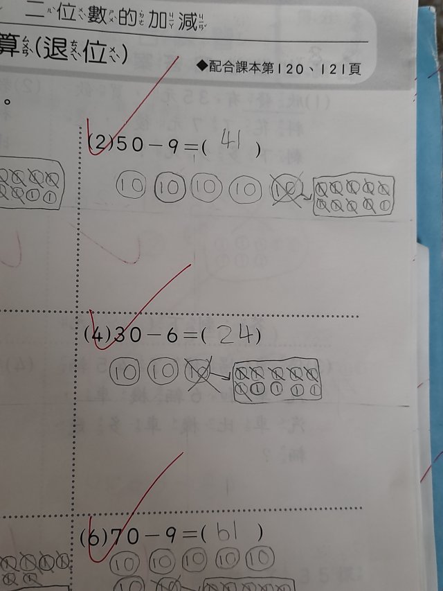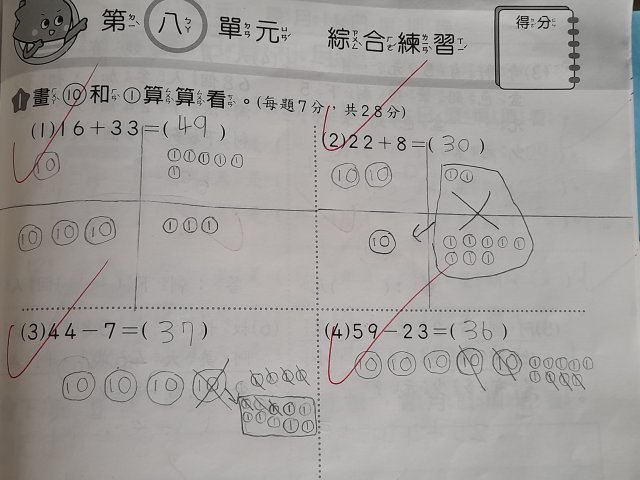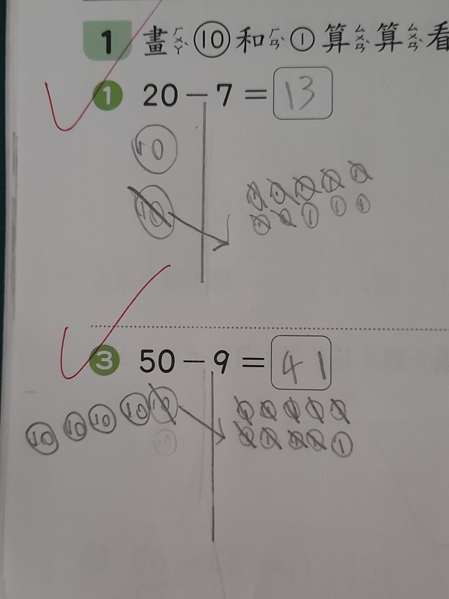 畫10元和1元算算看。(範例)(數習數重同學寫的)(留意進位退位)(退位要拿1個十來減,從10減)(一下康軒版數學L8)