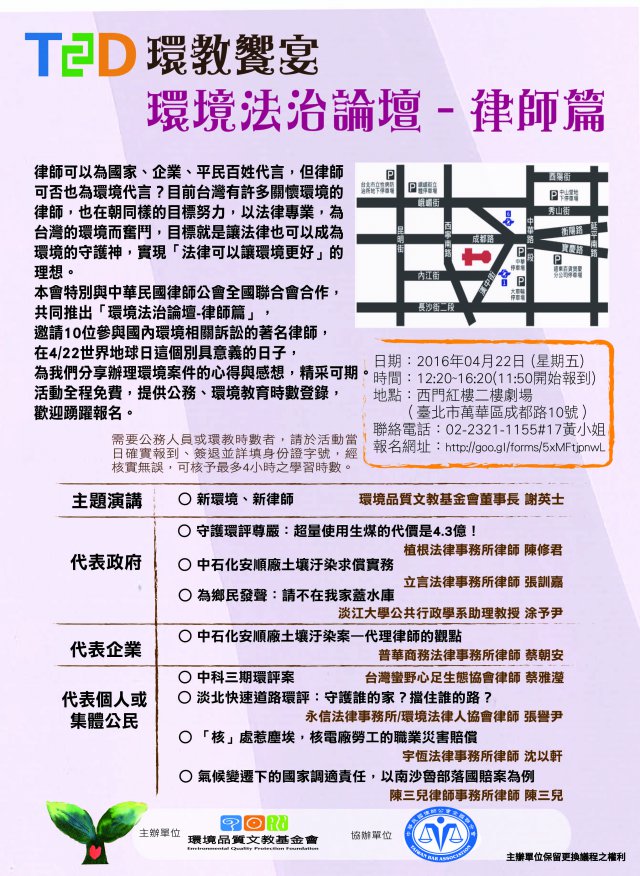 說明: 一、依據財團法人環境品質文教基金會105年2月22日環品字第1050222001號函辦理。 二、論壇為免費推廣,報名網址:http://goo.gl/forms/5xMFtjpnwL,可核予最多4小時環境教育、公務人員終身學習時數。 三、檢附活動議程1份,詳情請見官網最新消息http://www.eqpf.org/news.aspx?NwsMsgDBID=871。