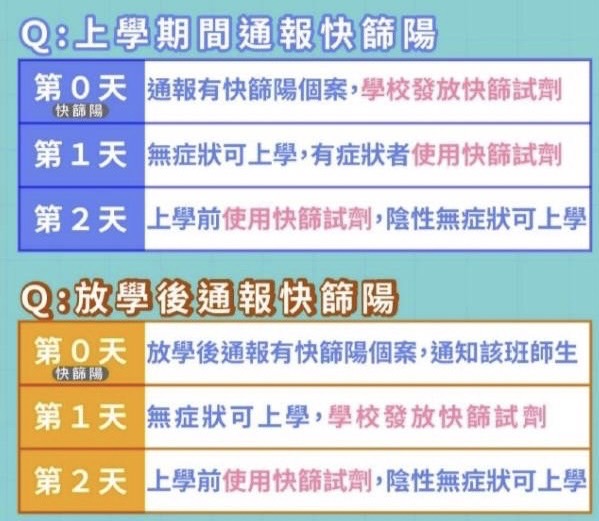 (確診日隔天算第一天, 居隔滿7天, 第8天快篩陰 ,傳快篩陰照片才能上學。) ,