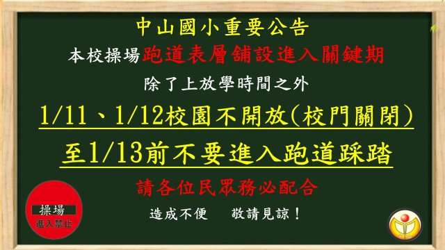 1/11(三)、I/12(四)、1/13(五)操場跑道施工,學校不開放運動。