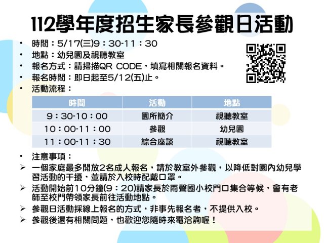 112學年度台北市士林區雨聲國小附幼招生家長參觀日