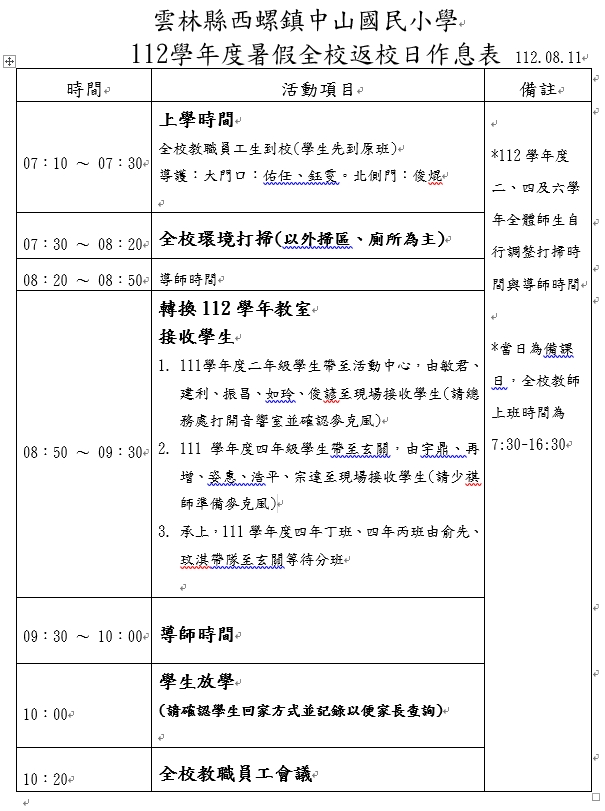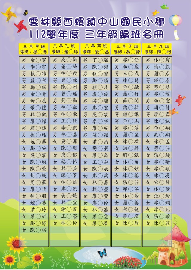 112.8.11(五)返校日早上請先回到二乙教室,返校日10:00放學,附上三年級編班名單及8/11返校日作息。