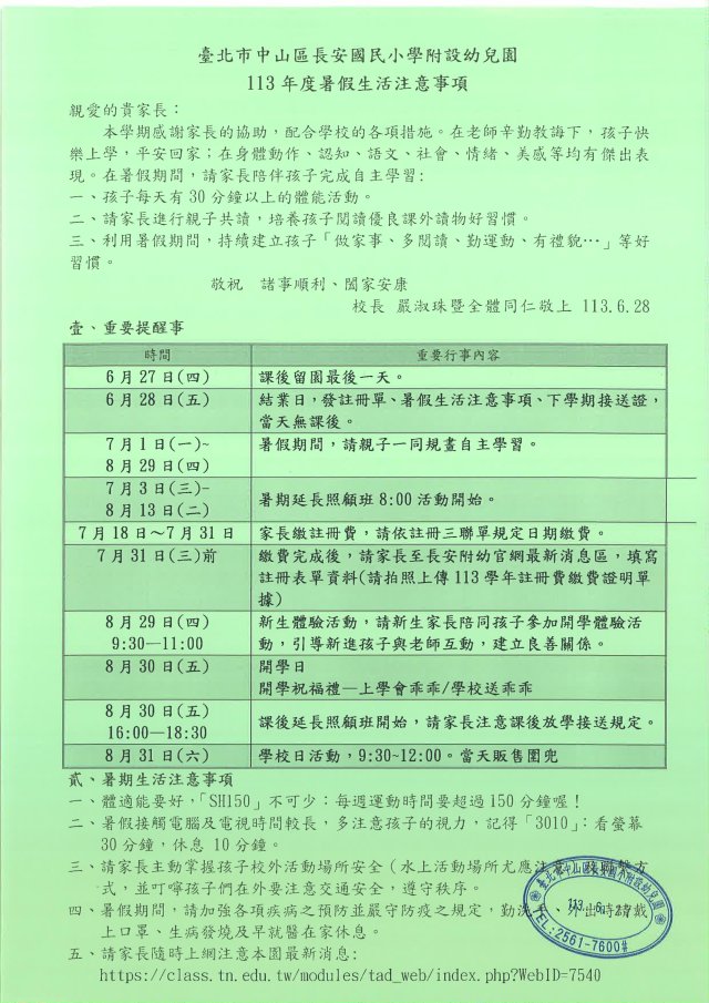 112學年即將圓滿結束!!感謝大家一直以來的配合與協助。7月1日暑假即將開始,請家長們熟讀113年暑假生活注意事項,內容包含:新生註冊領取資料、暑假延長照顧活動、註冊注意事項、新生體驗、開學活動、開學日、學校日等。