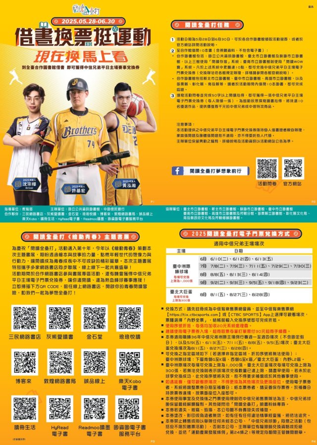 任務三:至1樓流通櫃台使用APP『閱讀wow寶』功能,兌換「中國信託-閱讀全壘打中信兄弟平日主場賽事兌換券」,並出示線上表單填畢截圖,即可領取門票(限一證一張)