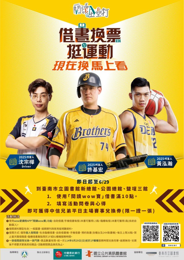 南市圖首次與中信合作啦!!~~中國信託銀行攜手中信兄弟棒球隊,推出閱讀全壘打公益專案,只要借書集點完成指定任務,即可兌換球賽門票!一起點燃球迷魂,登上觀眾席,讓知識與熱血在夏日共同開轟!