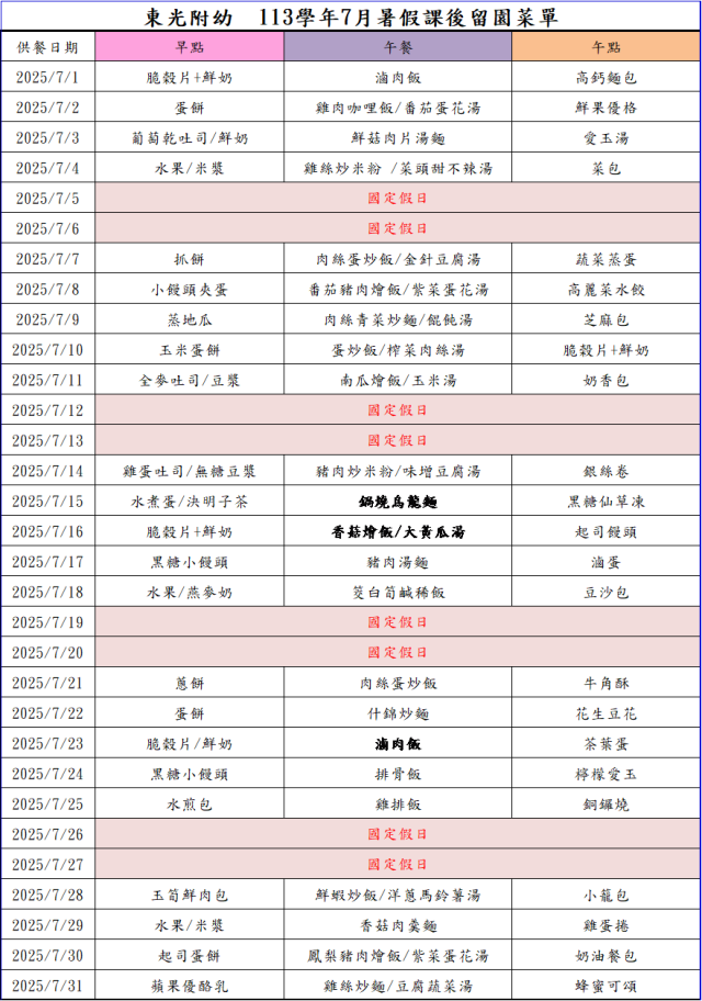 113學年度第二學期7月份餐點表