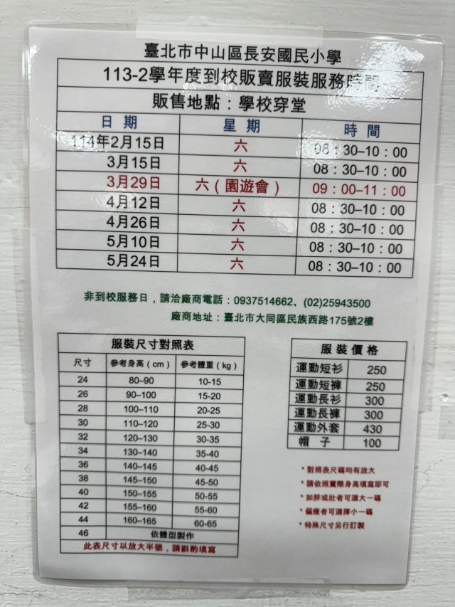 1.如有需要購入*餐碗以及圍兜兜*的家長,提供您廠商設攤時間於8/30學校日的8:30-12:00,設攤位位置在南穿堂(幼兒園一樓靠電梯出入旁)。 2.國小販售*運動服時間*依照官網為長安國小校網公告時間為主(詳細時間及尺寸請參見附檔)