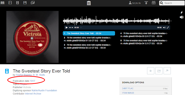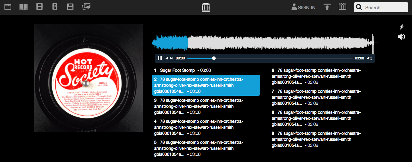 這裡收集的都是 1950 年代之前的早期黑膠唱片,所以大多數唱片裡面只有一首歌曲。但是你可以看到很多個不同數位錄音版本的檔案。