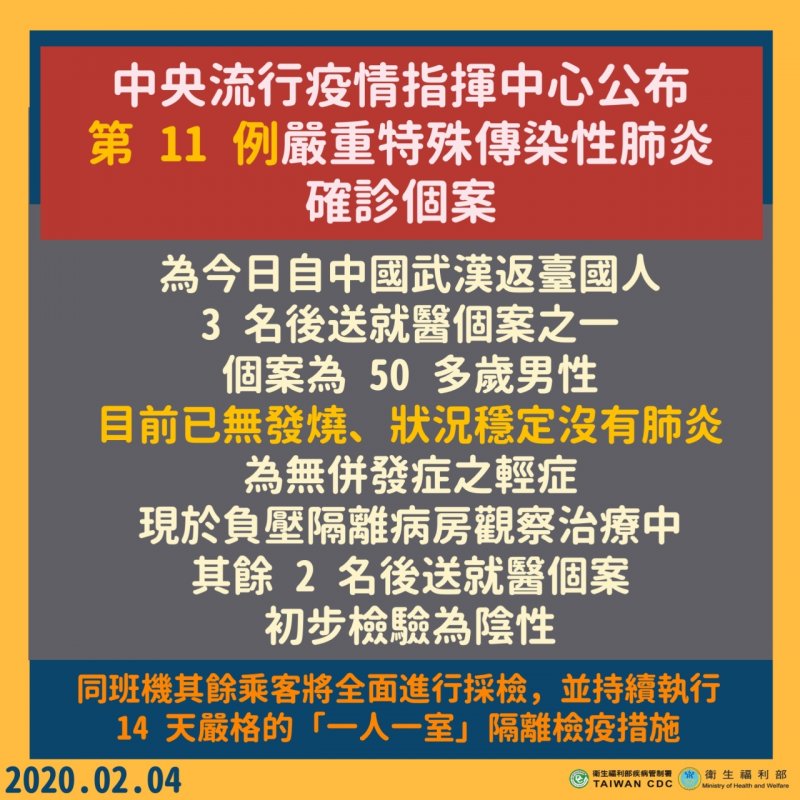 中央流行疫情指揮中心公布第11例嚴重特殊傳染性肺炎確診個案