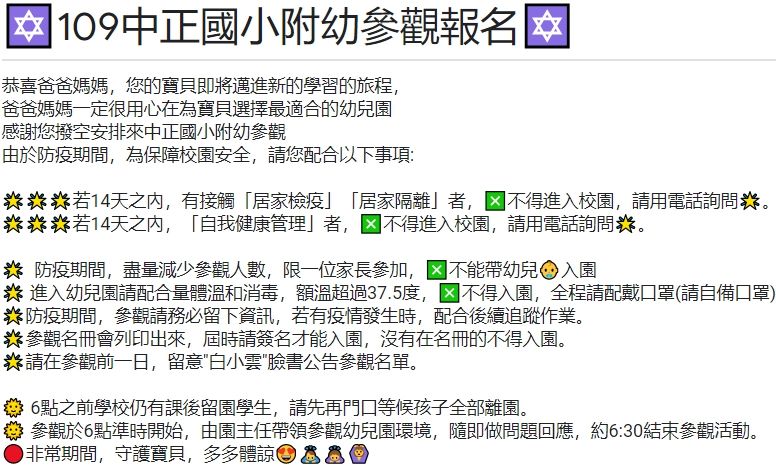 防疫期間,為保障校園安全,請您配合以下事項(詳閱圖片說明)) 防疫期間,採預約參觀,請先臉書私訊白小雲,提供google表單,填寫報名表 白小雲臉書:https://www.facebook.com/profile.php?id=100020064782145