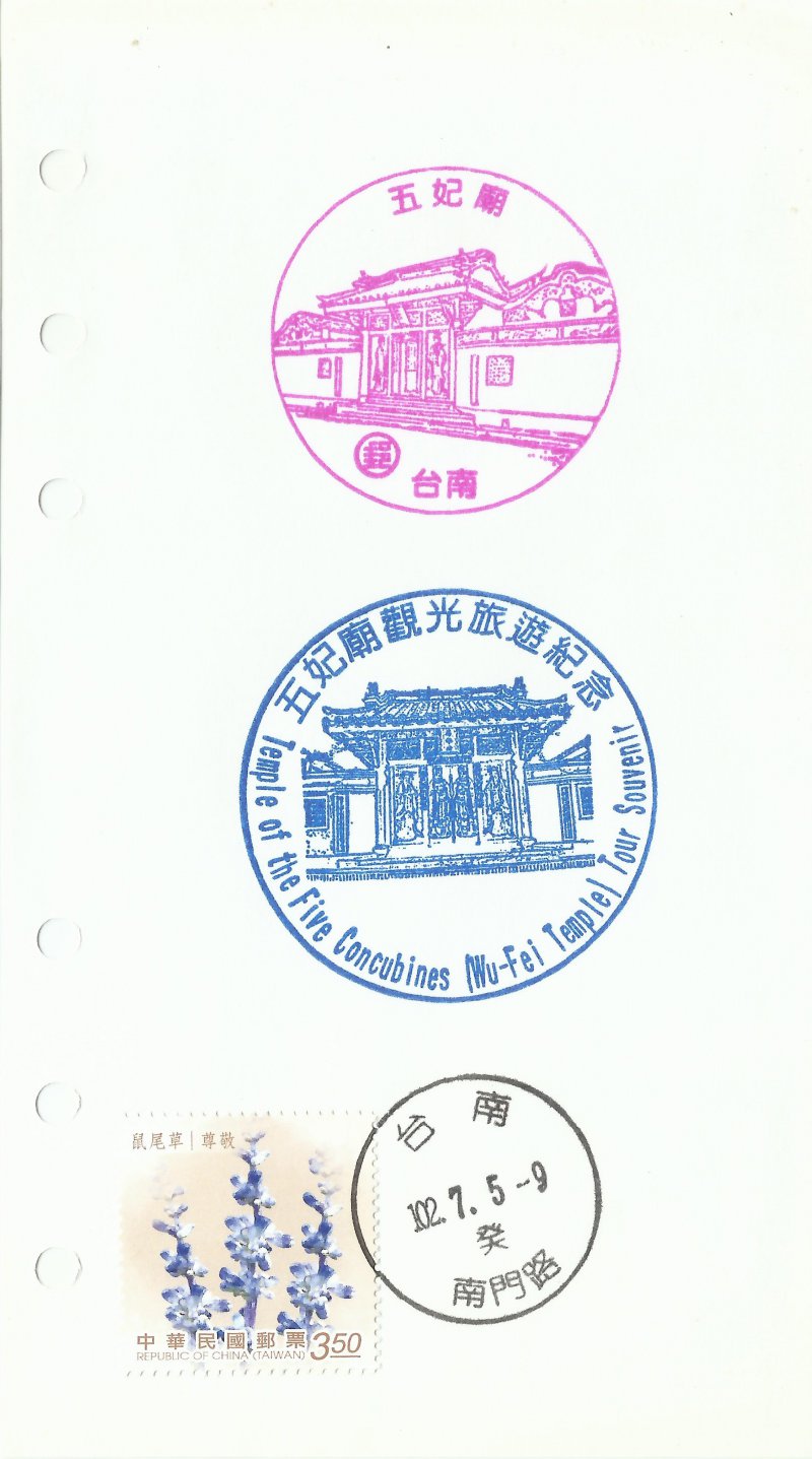 五妃廟並沒有相關的郵票發行,找了很久,最後決定採用花語郵票中的鼠尾草圖案,因為它的花語是「尊敬」,選用此枚郵票向五妃當年的義行致敬,最恰當不過了!