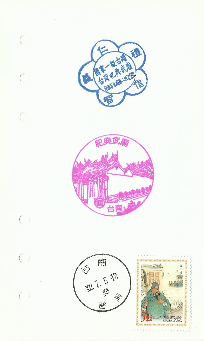 蓋銷票的郵票主題為單刀會,故事內容描寫孫權邀宴關羽,想趁機會迫索回莉州。關羽單刀過江赴會,從容鎮定,臨危不懼,多年能安然返回。圖案才描繪關公捻鬚持刀,儼然立於江中渡船上,表現成武氣概與凜然正氣,正與此廟彰顯的價值前後呼應。