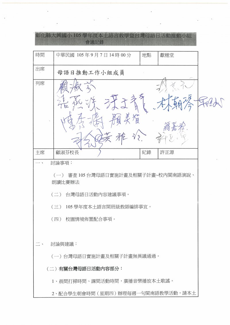 一、 討論事項: (一) 審查105台灣母語日實施計畫及相關子計畫~校內閩南語演說、朗讀比賽辦法 (二) 台灣母語日活動內容建議事項。 (三) 105學年度本土語言開班級教師編排事宜。 (四) 校園情境佈置配合事項。