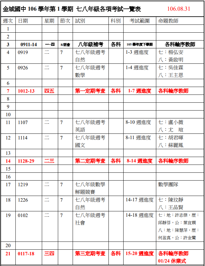 【考試訊息】106-1 七八年級各項考試時間一覽表