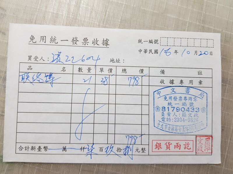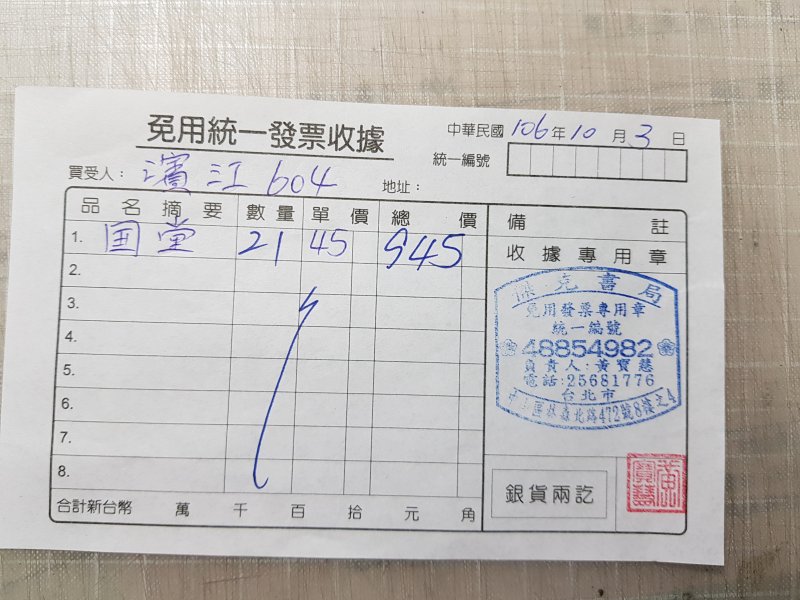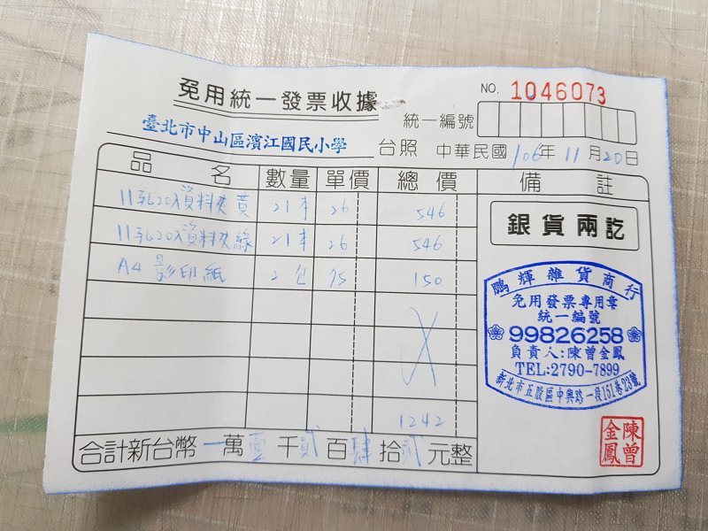 106/11/20 | A4影印紙 | 75 | 2 | 150 |