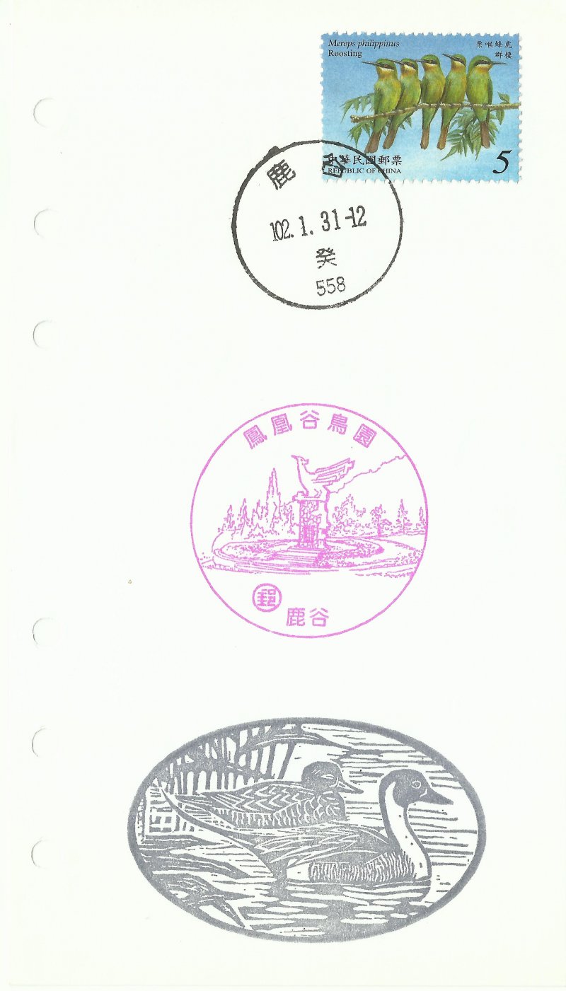 鳳凰谷鳥園主要以展示鳥類為主的教育園區,所以選用鳥類郵票為蓋銷票。另一顆紀念章則來自「三義ㄚ箱寶」。章戳內容是一對尖尾鴨,作者是赫赫有名的大師----何華仁,也是panda最喜歡的章戳之一。