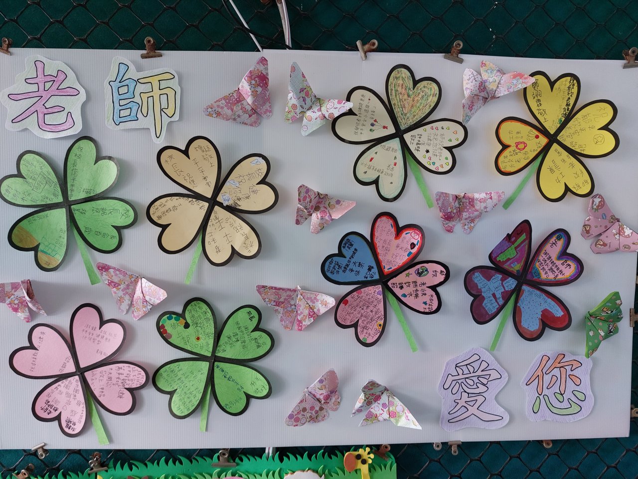 學生利用色紙摺出一隻隻立體蝴蝶並利用愛心寫出對校長主任與低年級導師的祝福,變成幸運草送給老師們