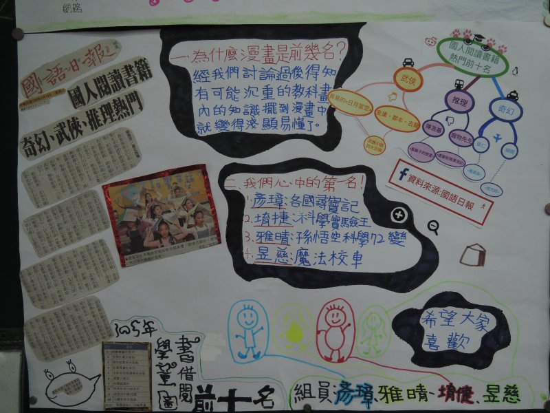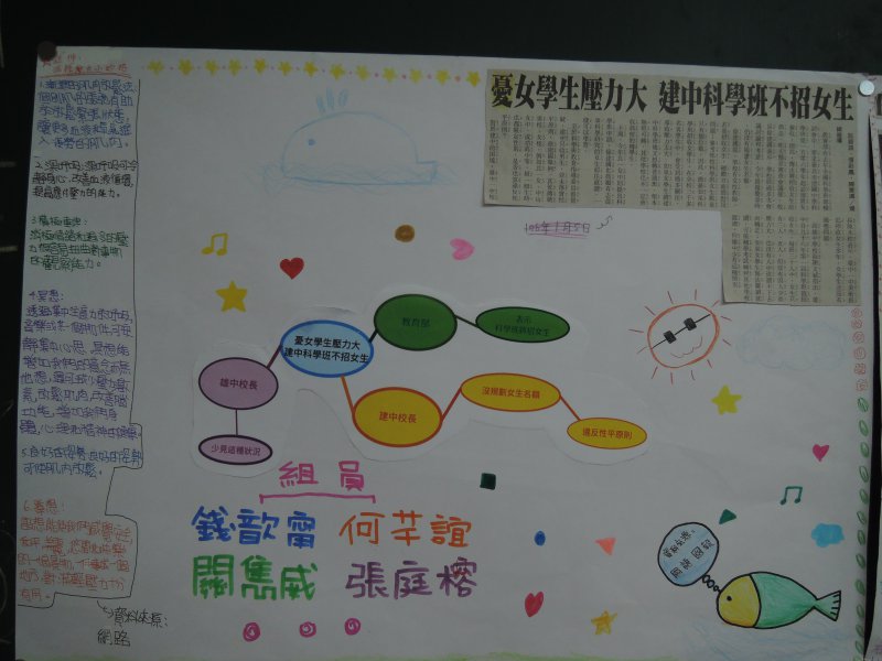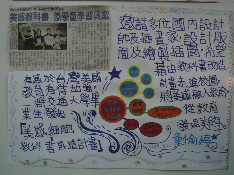 以小組合作方式,由同學討論並繪製心智圖,再輸出、美化編輯,最後加上剪報與延伸學習,終於完成這些作品。