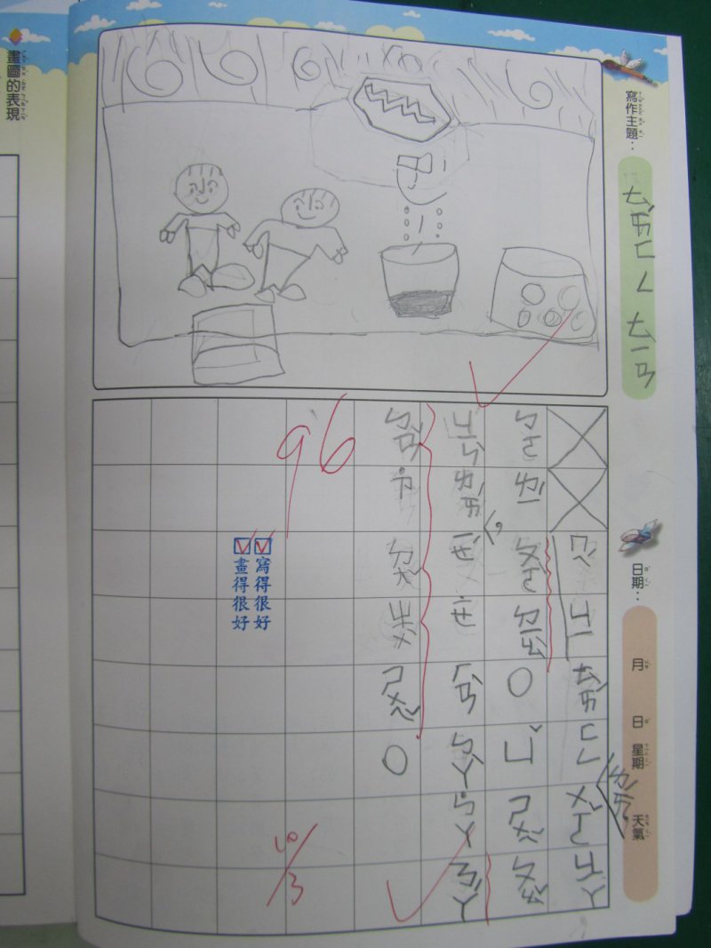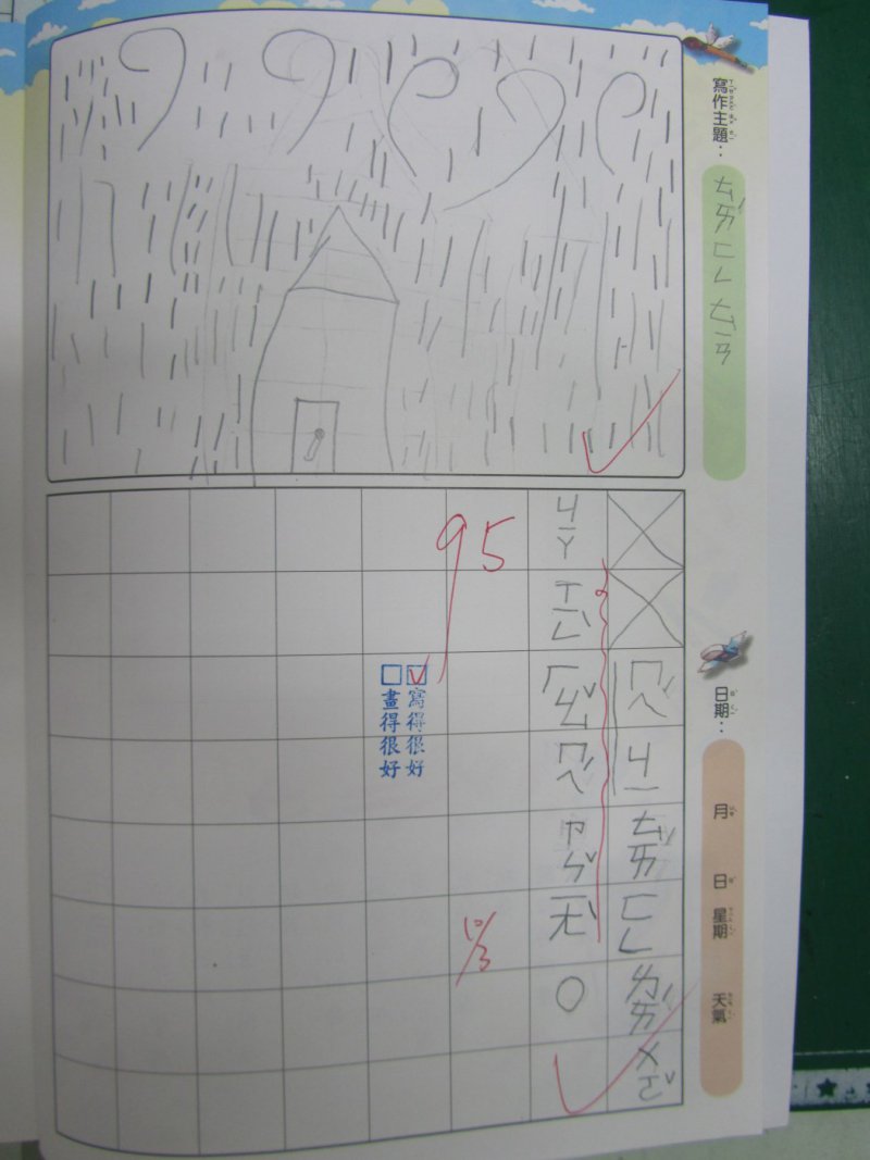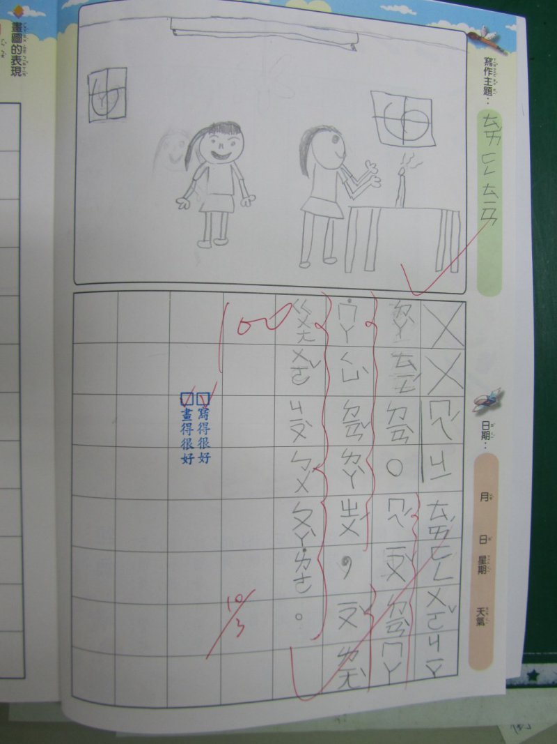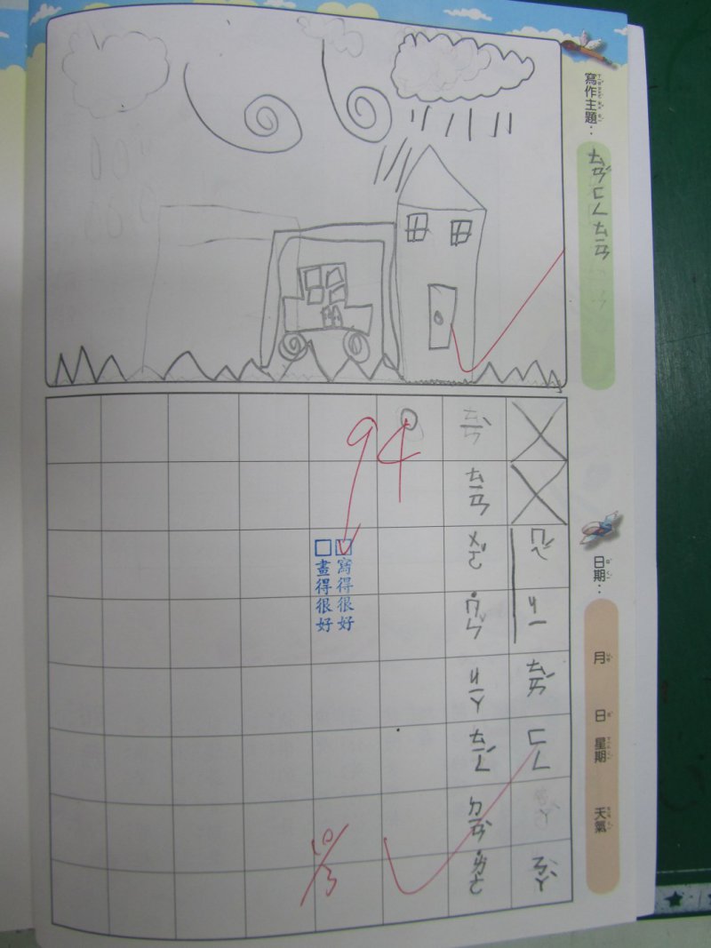 梅姬颱風過後,老師和我們聊天,問我們颱風那一天我家怎樣了?你看到什麼聽到什麼?最後,我把我說的用筆寫下來。
