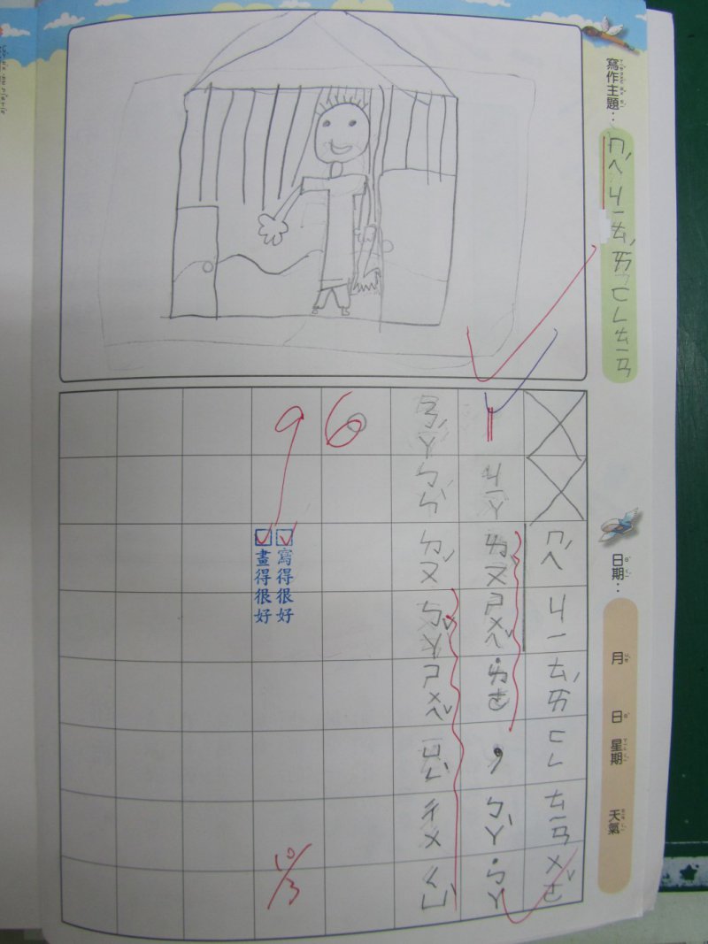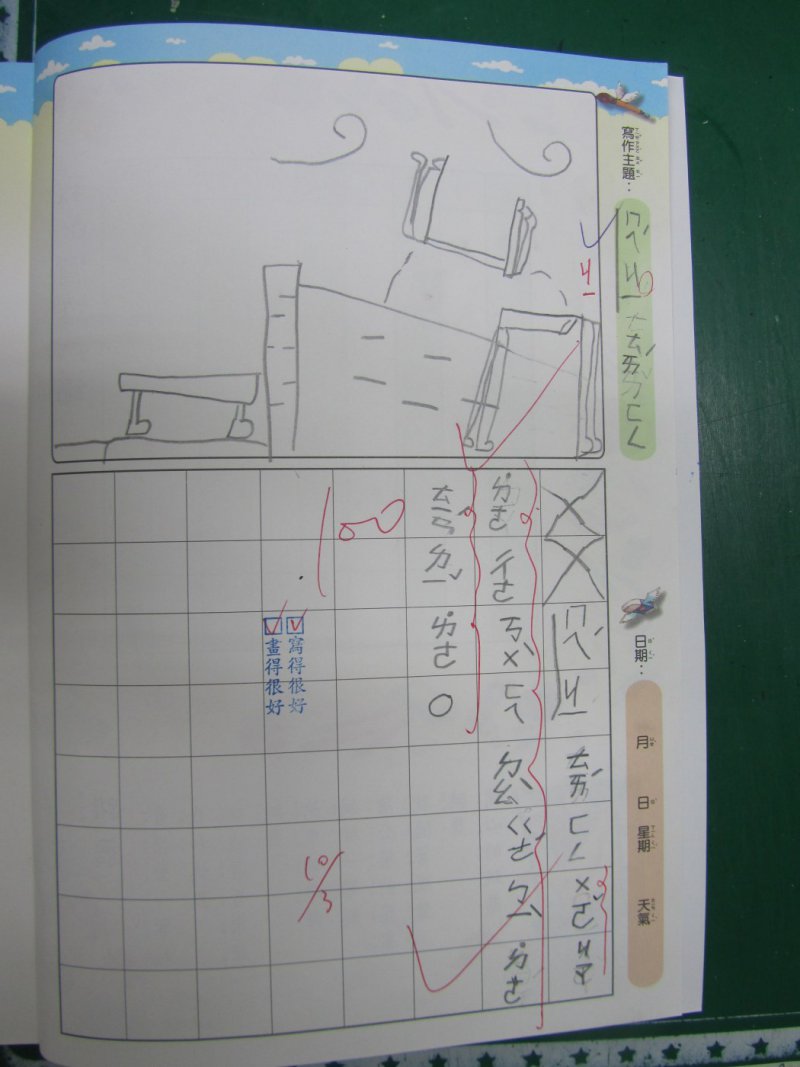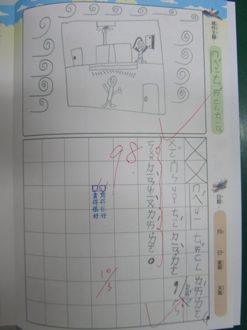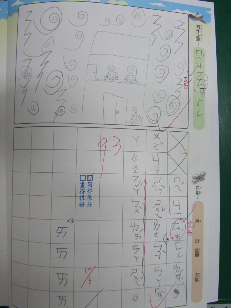 梅姬颱風過後,老師和我們聊天,問我們颱風那一天我家怎樣了?你看到什麼聽到什麼?最後,我把我說的用筆寫下來。