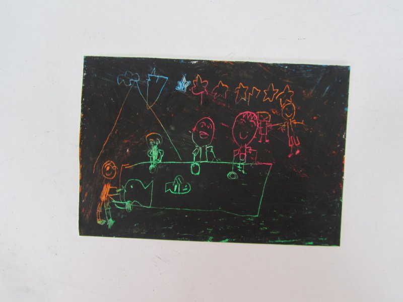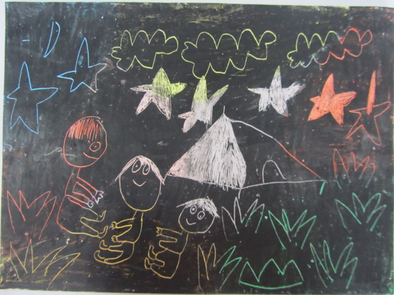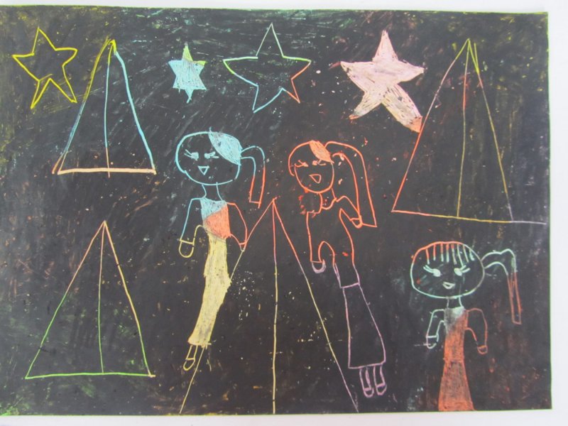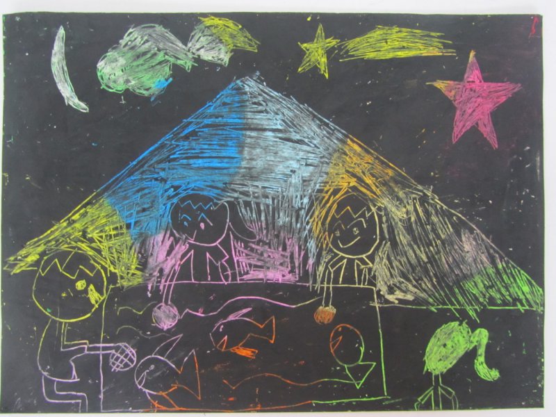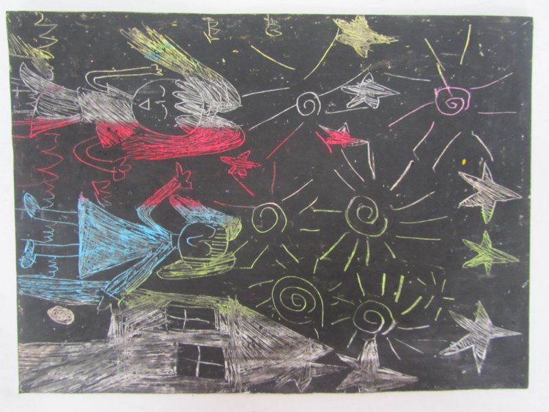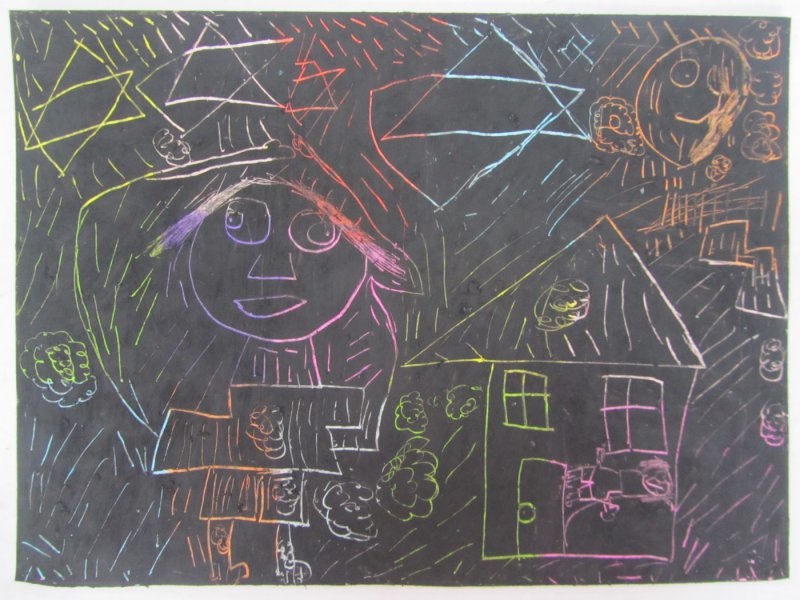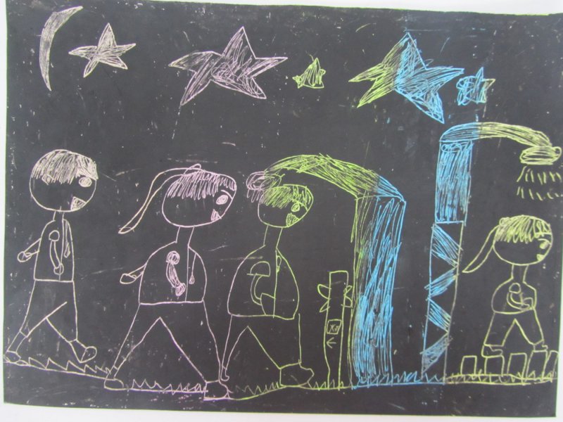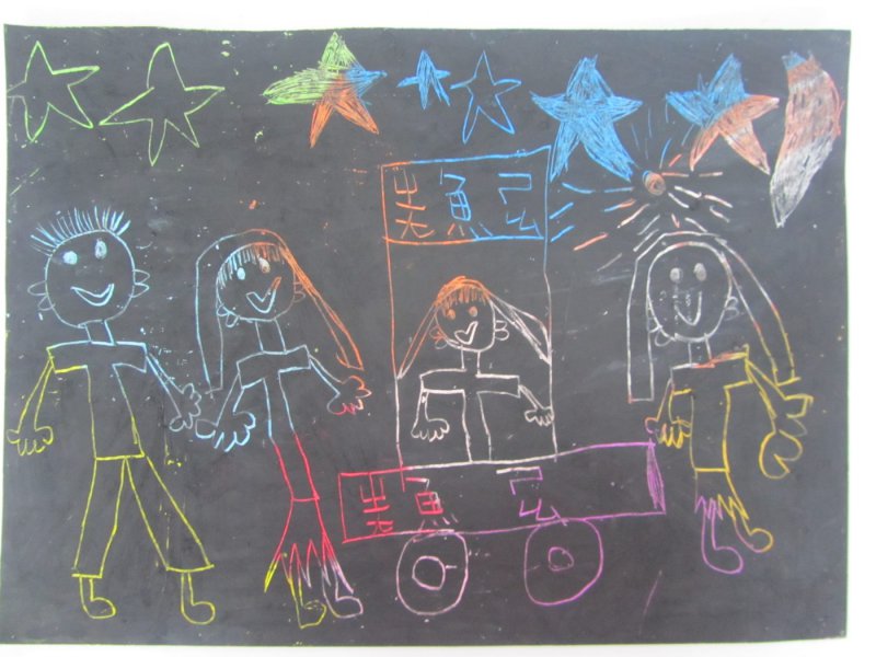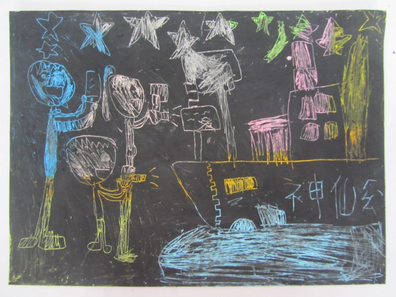 先把底層用鮮艷的色彩塗滿,再蓋上一層黑,最後用竹籤刮出我要的圖案。一張夜晚的生活情景就出來了。