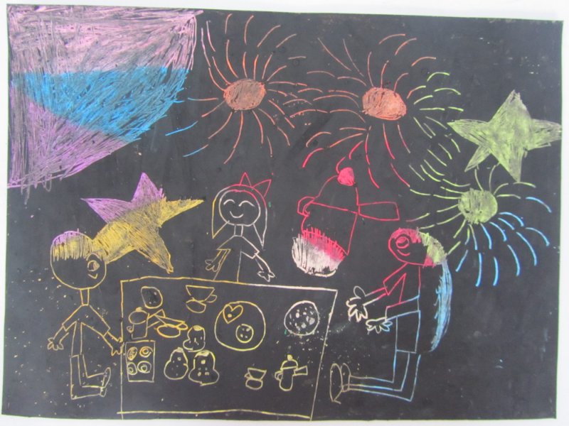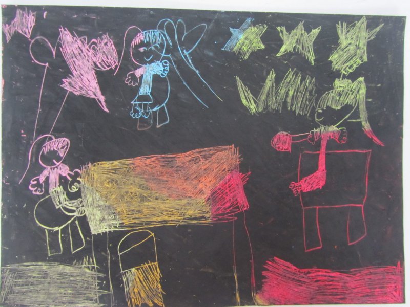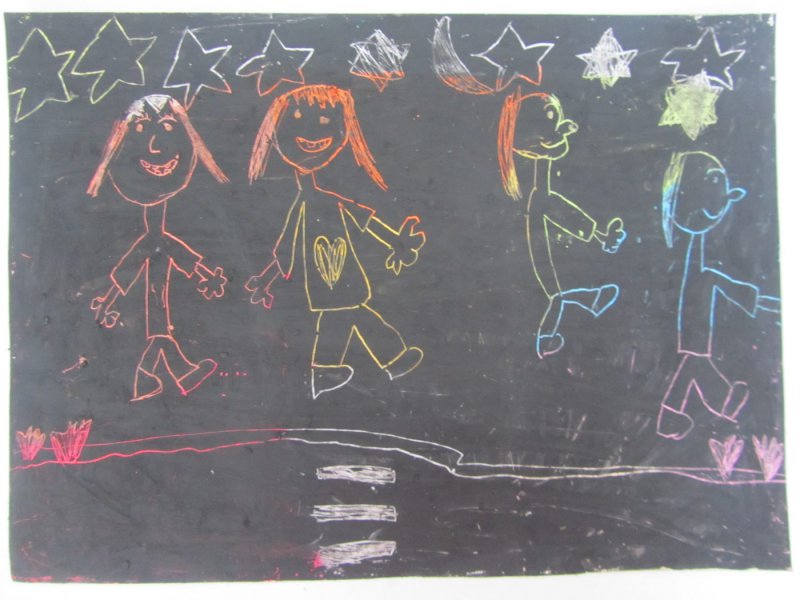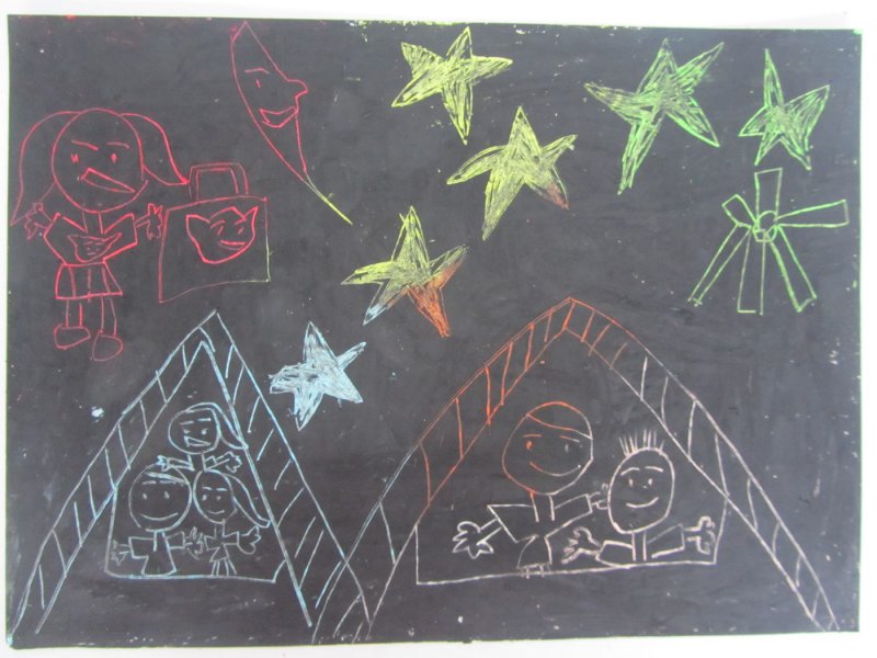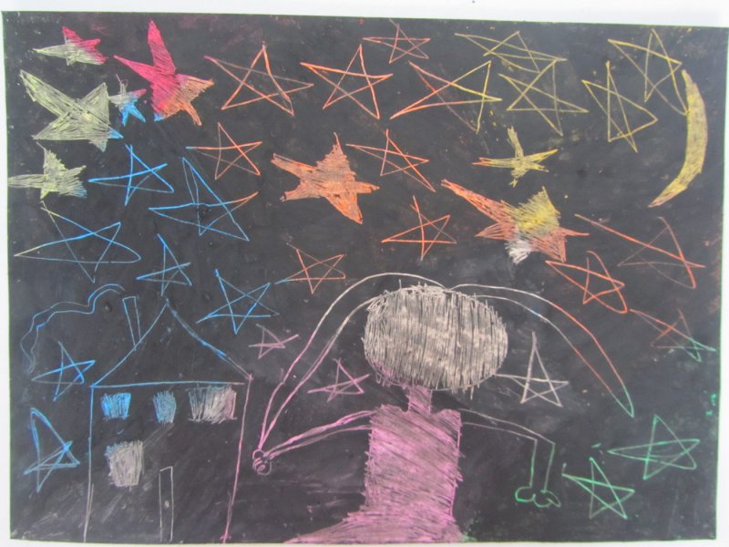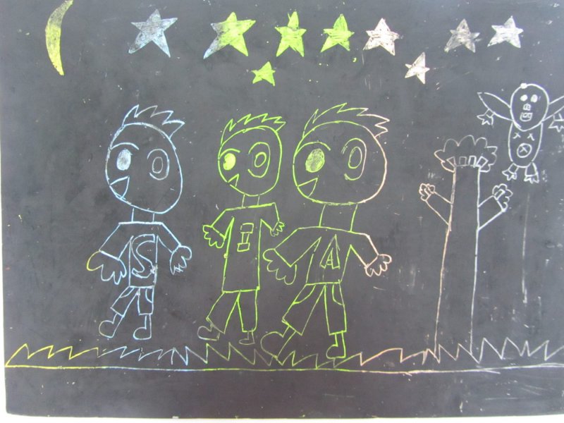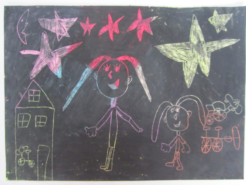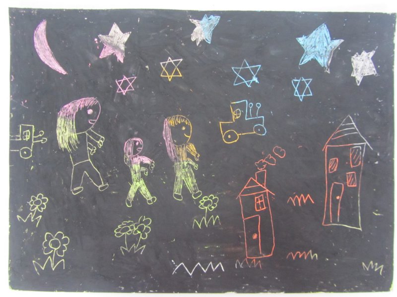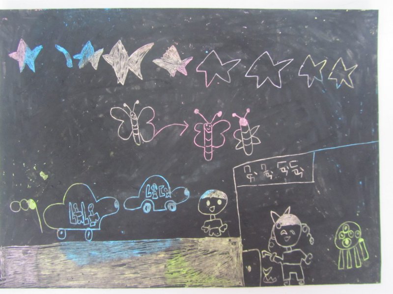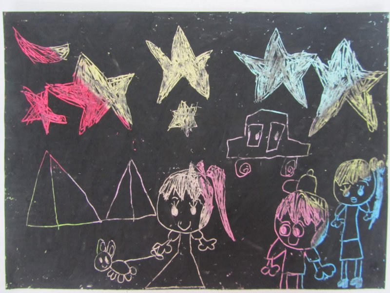 先把底層用鮮艷的色彩塗滿,再蓋上一層黑,最後用竹籤刮出我要的圖案。一張夜晚的生活情景就出來了。