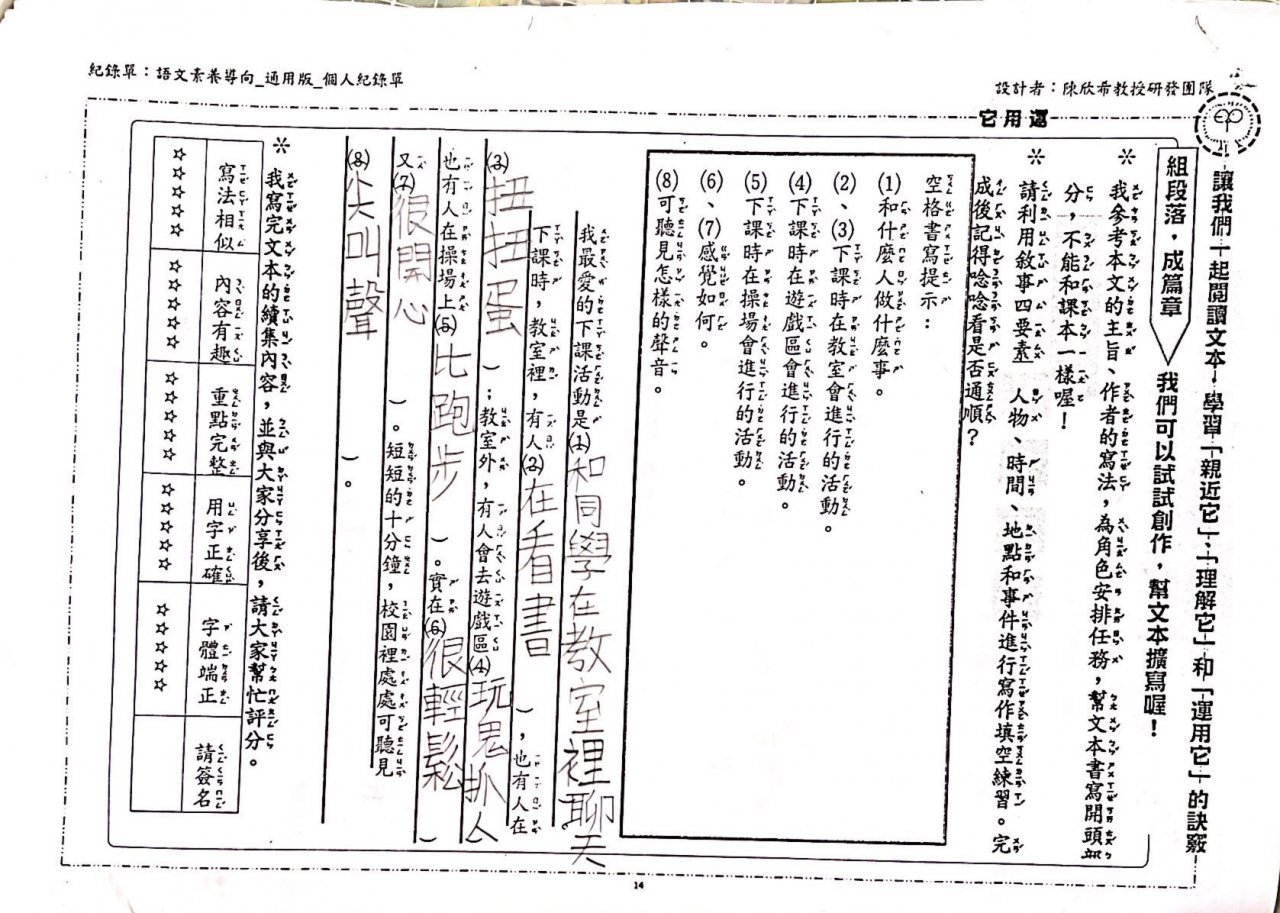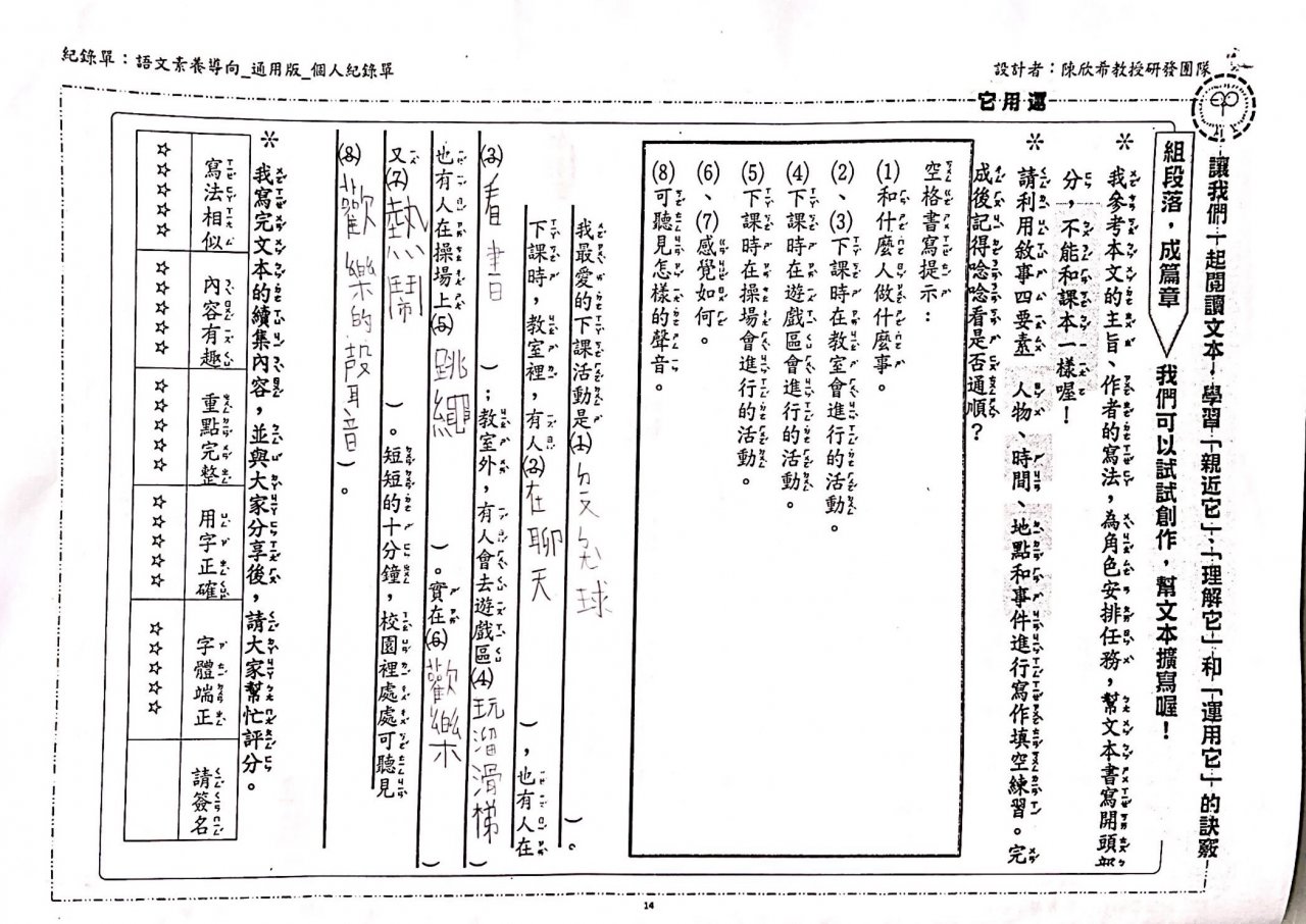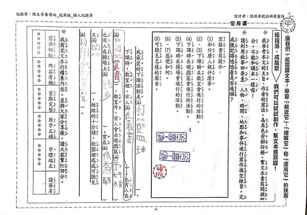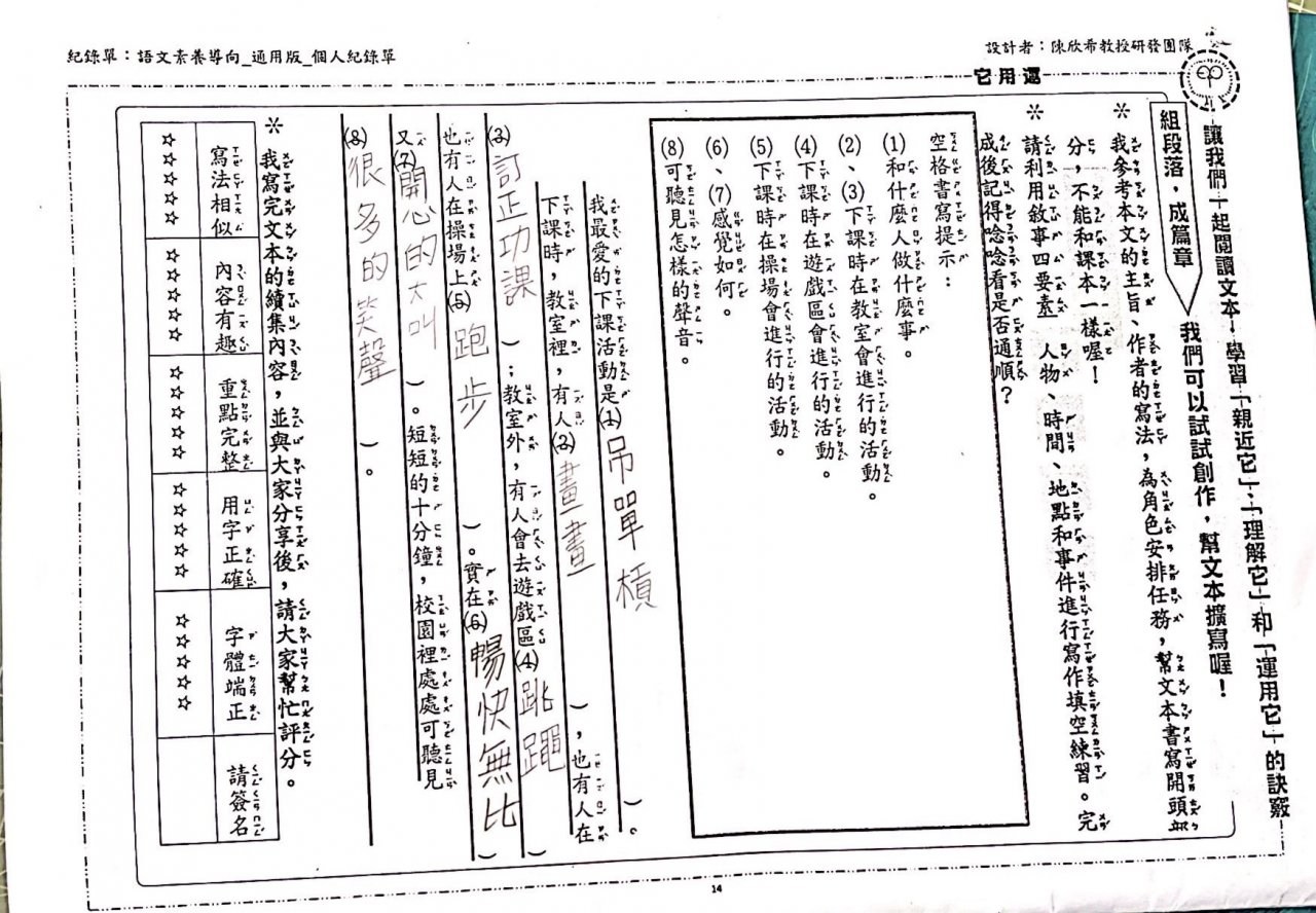班上有一群很棒的寶貝,把老師教的閱讀理解策略運用得很不錯喔!在此提供給家長與其他寶貝們參考,也希望其他寶貝們趕快邁開你們的腳步,和我們一起堅定前行。老師願意等你們,但是別充電太久,一起來體驗課程有趣的地方。