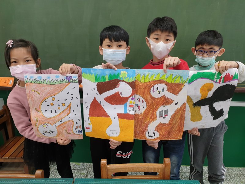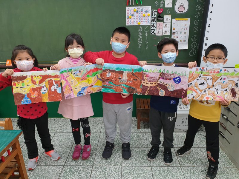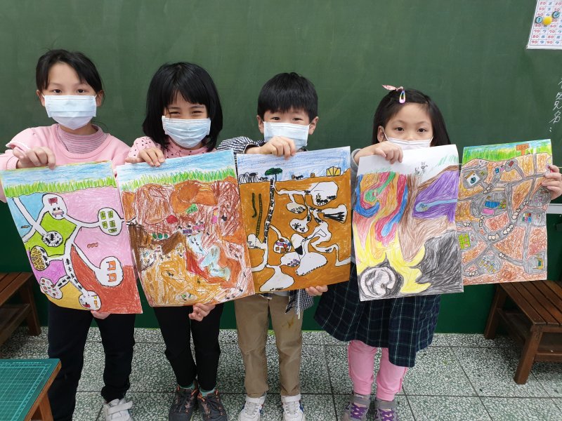 這次透過小組合作的方式進行繪畫,小朋友體驗小組組員不同想法的創作彼此刺激過程,激發出不同的作畫畫風。