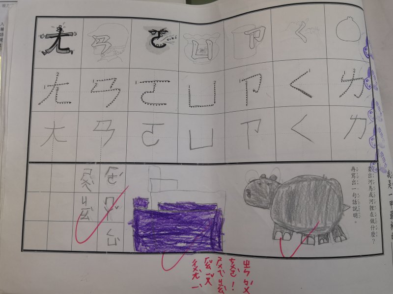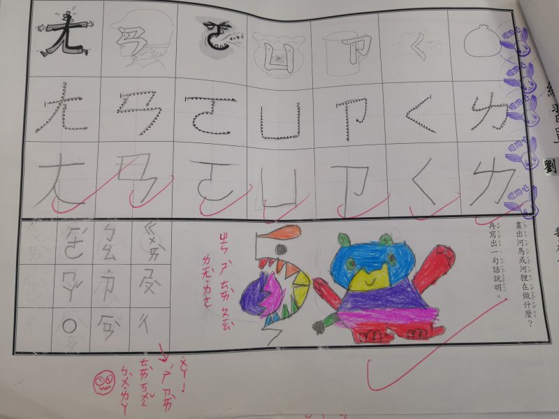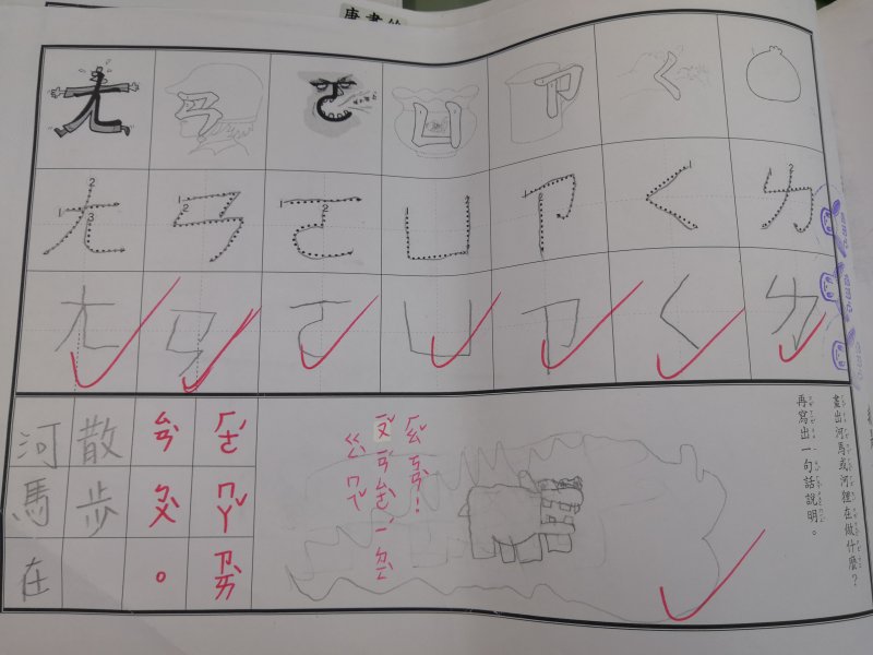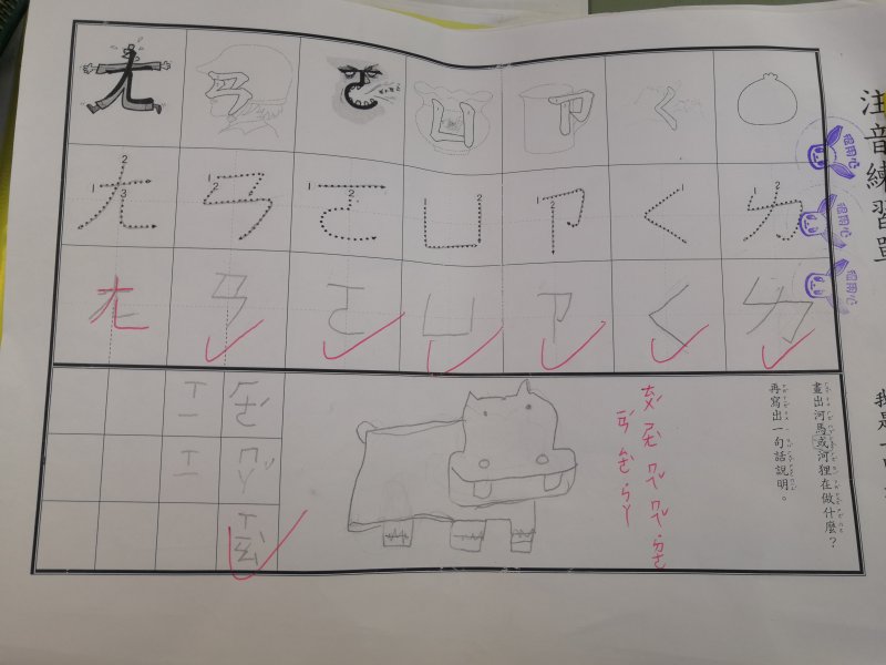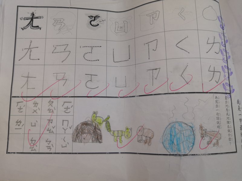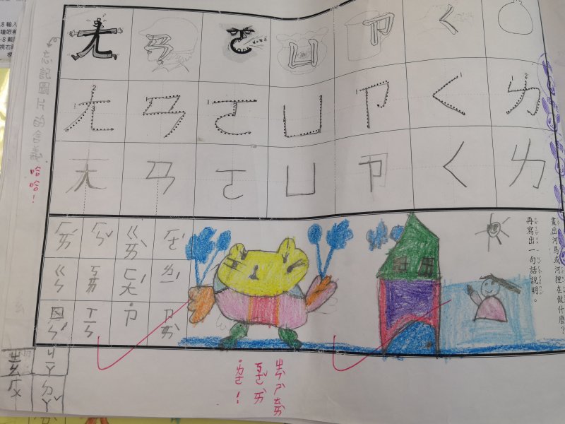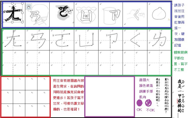 注音單的設計是為了符合學習注音歷程不同的小朋友,已經對注音琅琅上口的小朋友可以自由發揮寫句子,達到使用注音的目的;對於注音不太熟悉,則可以挑選課本上的句子來習寫,以達複習效果!加上畫圖,訓練寶貝們手不小肌肉的發達,其實是一舉數得呵!因此要請家長們多鼓勵小朋友多多嘗試、畫的圖要畫好畫滿,而不是隨便畫幾筆!相信寶貝們會越來越棒唷^^