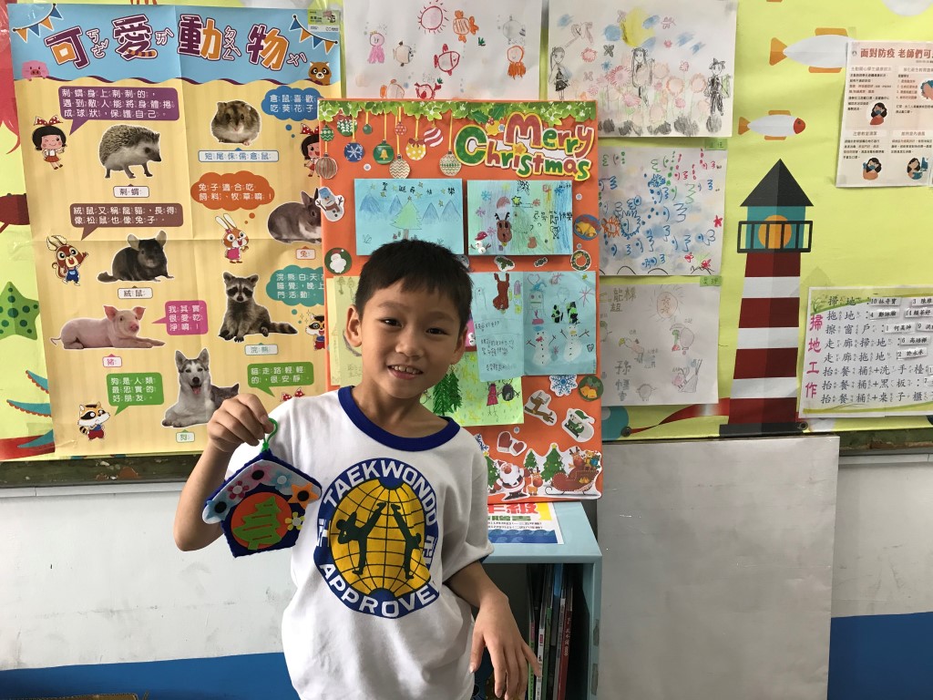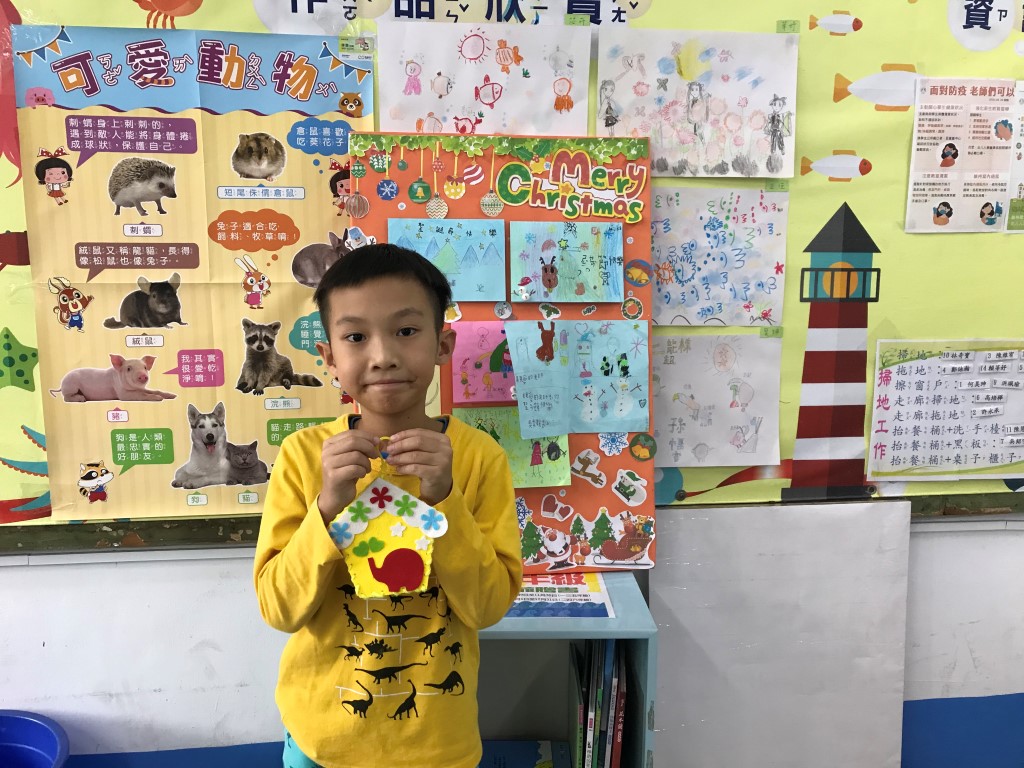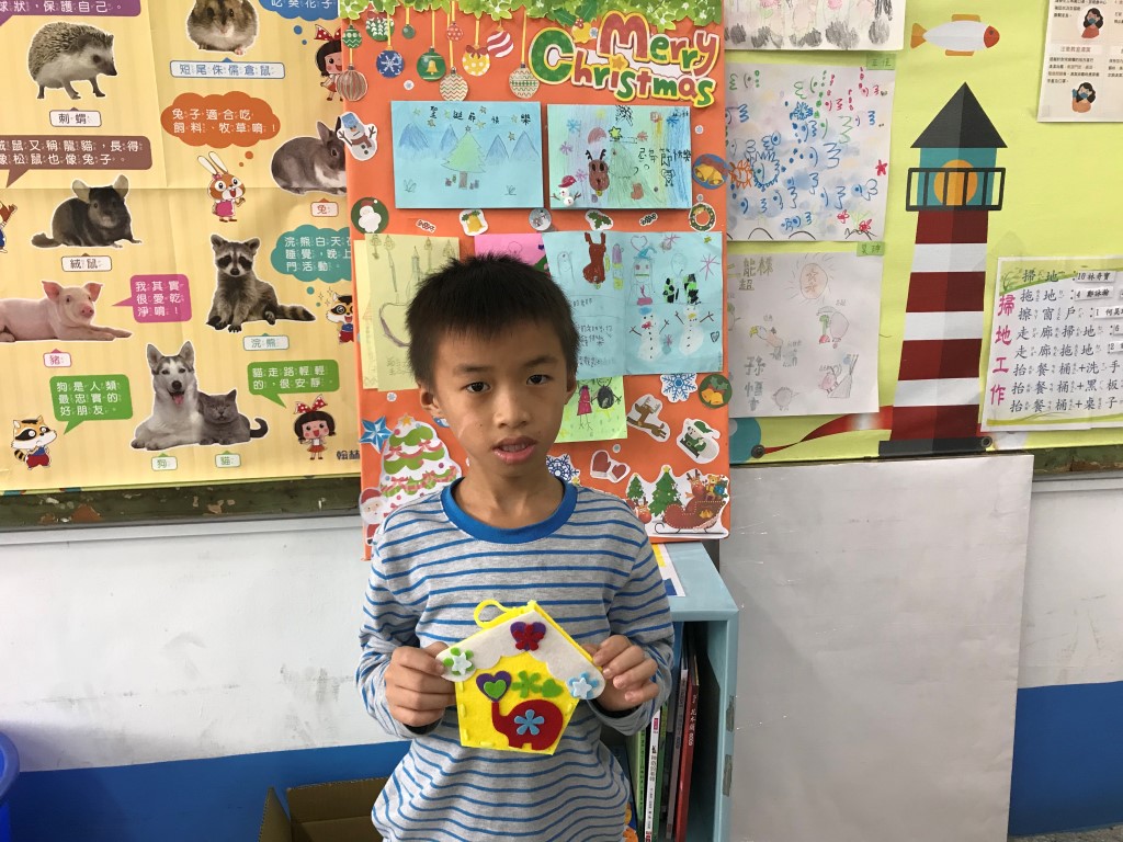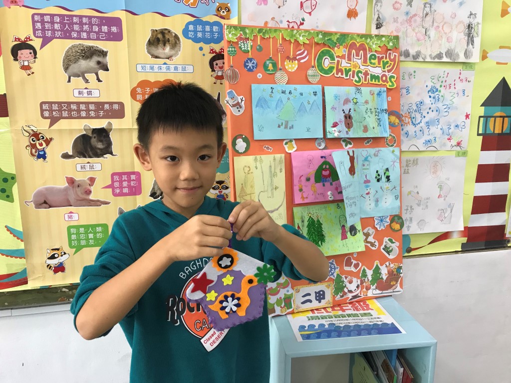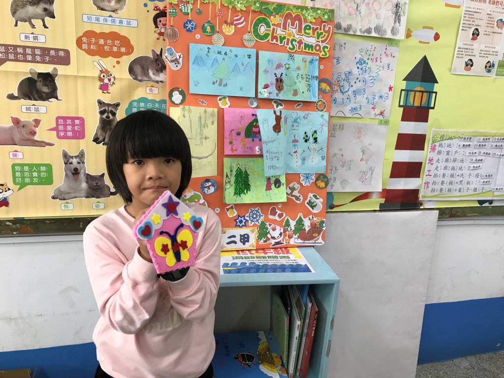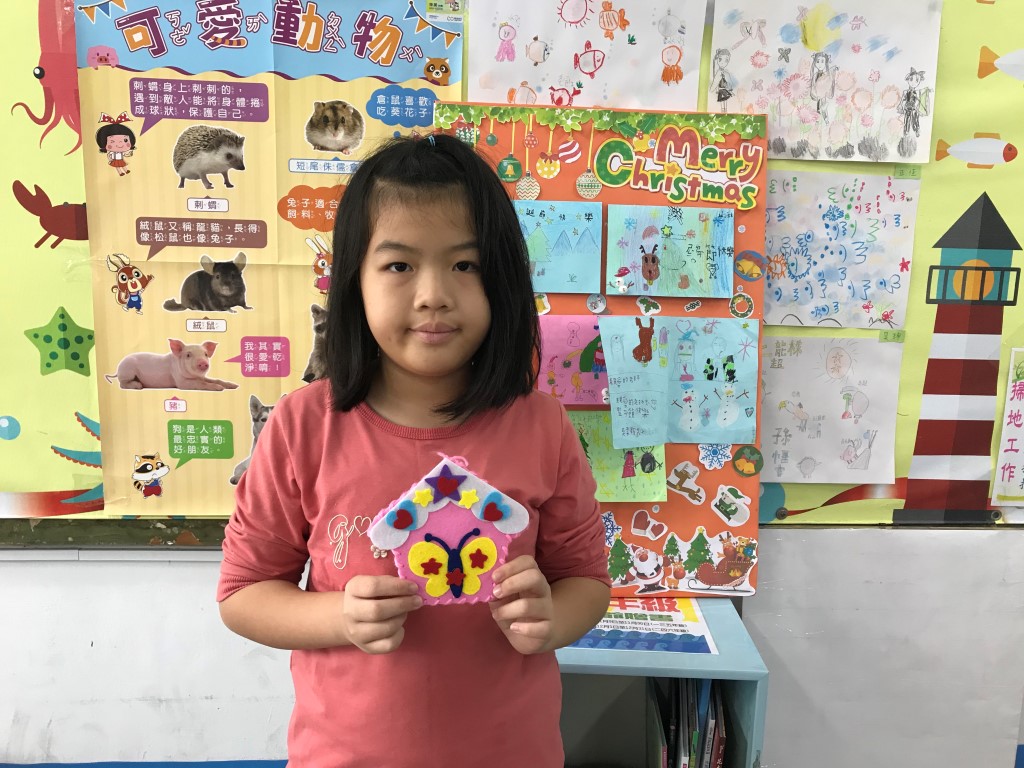 利用不織布,先逢出小屋的外型,再組合歡樂小屋的圖案喔!