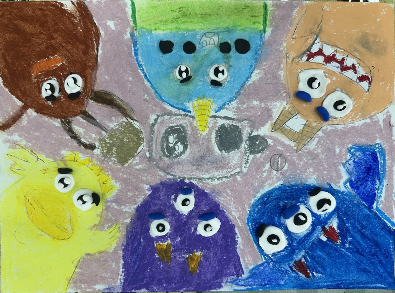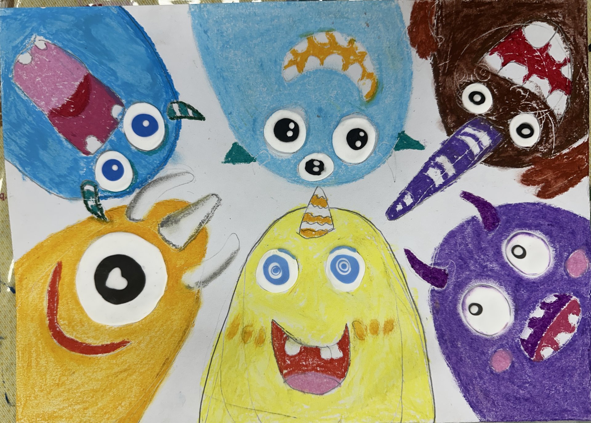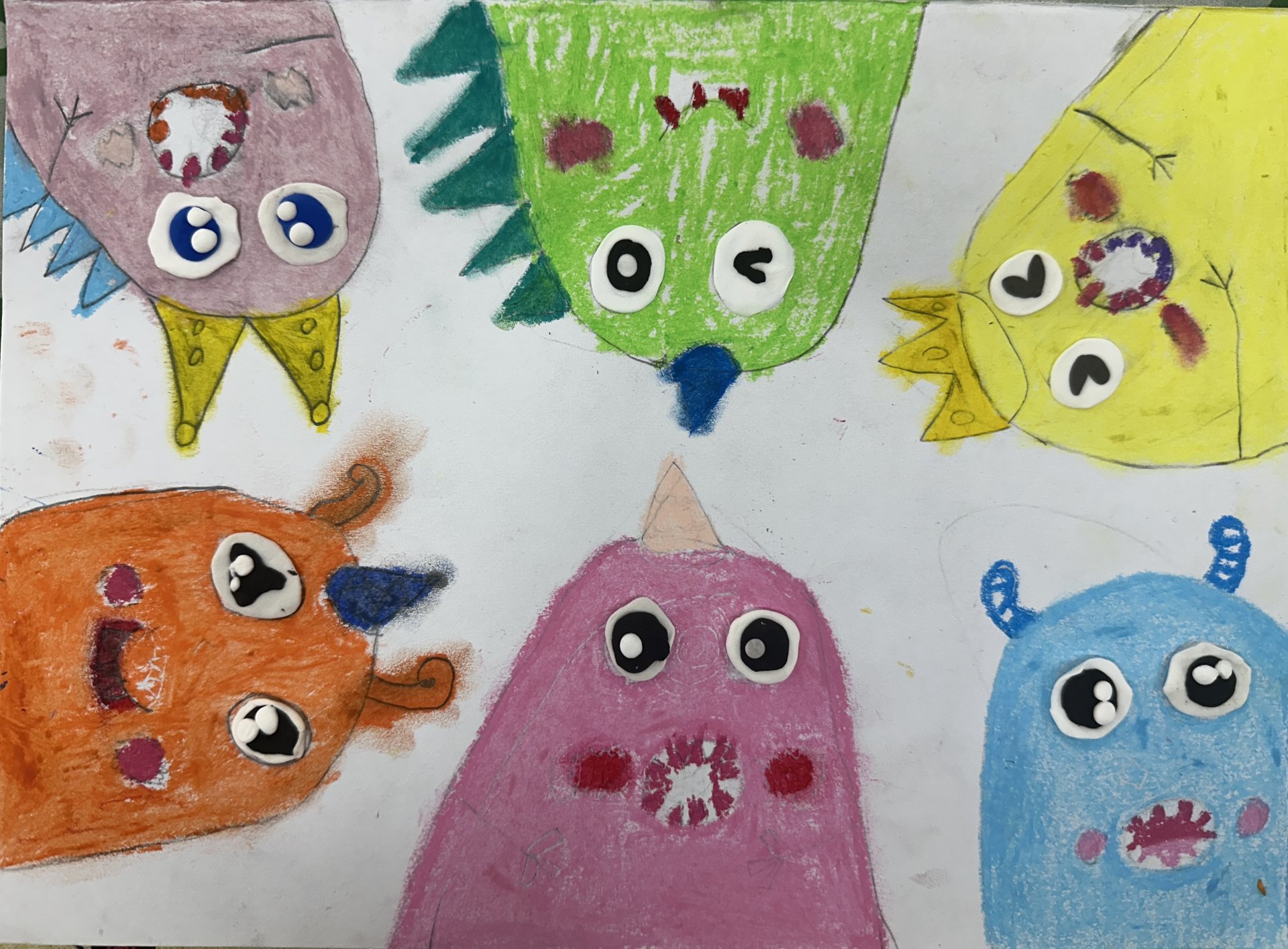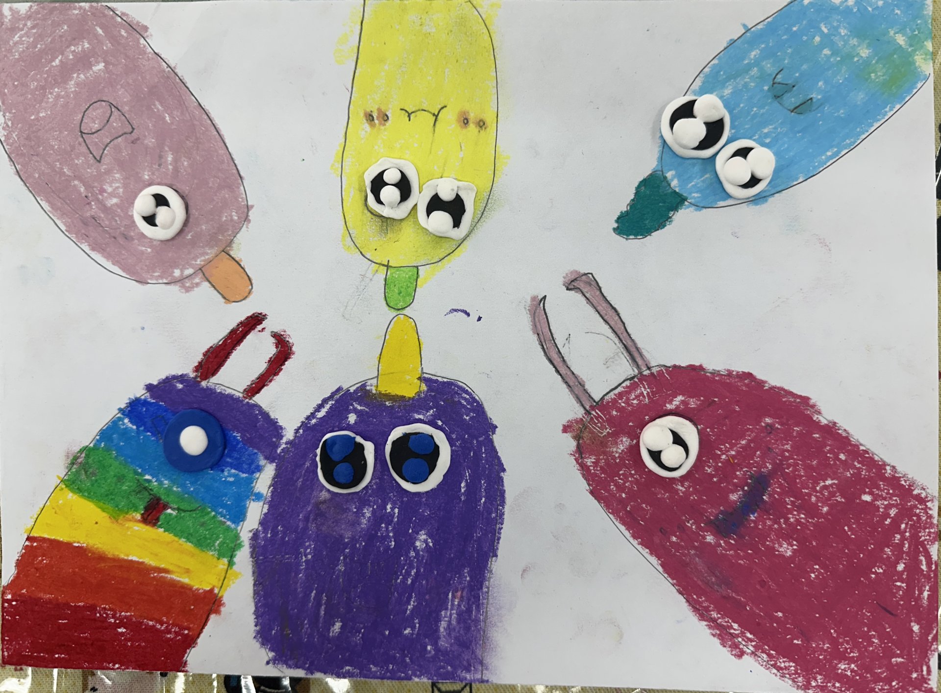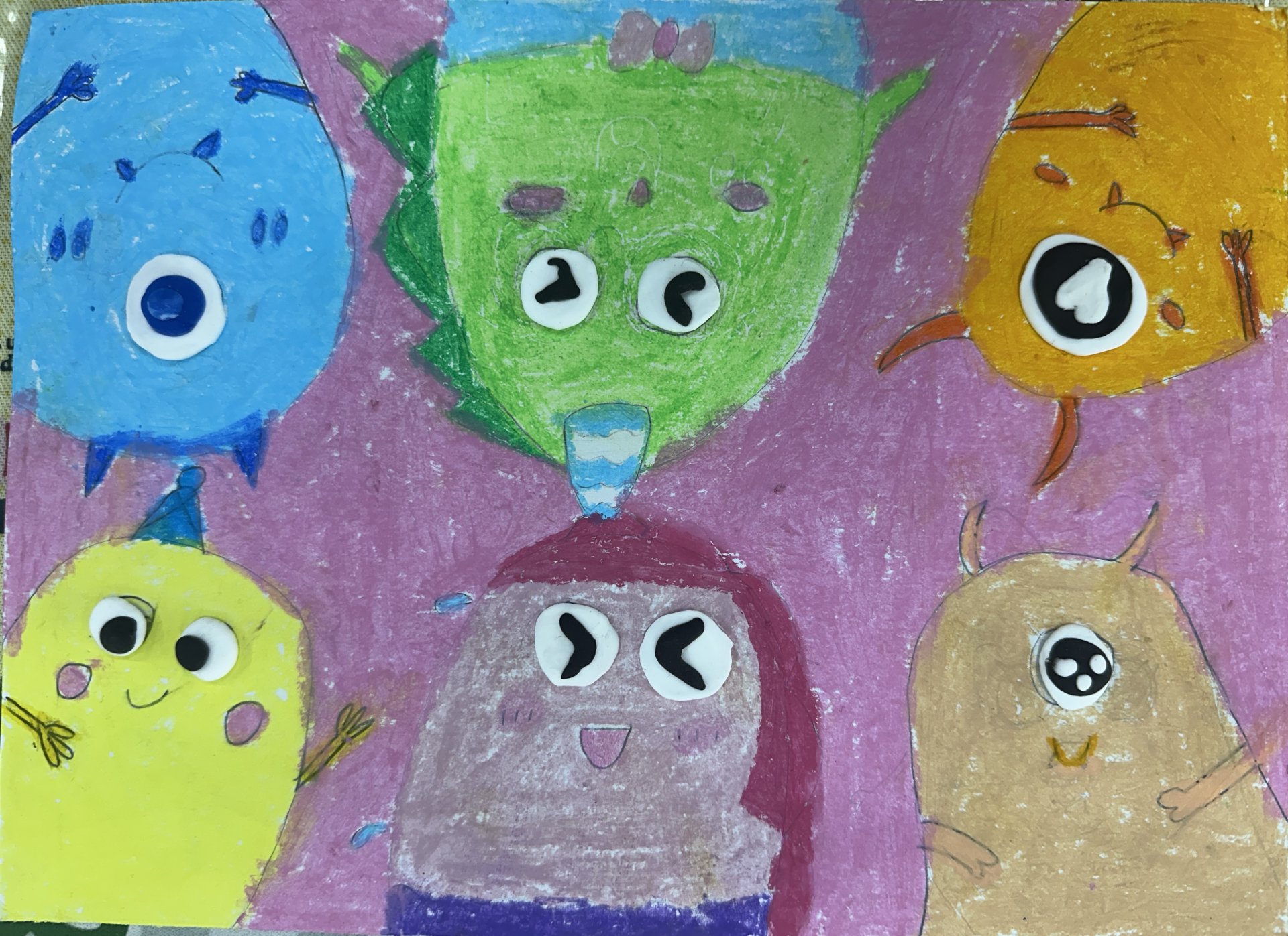 美術課畫的作品,使用黏土貼上眼睛變得更可愛了。