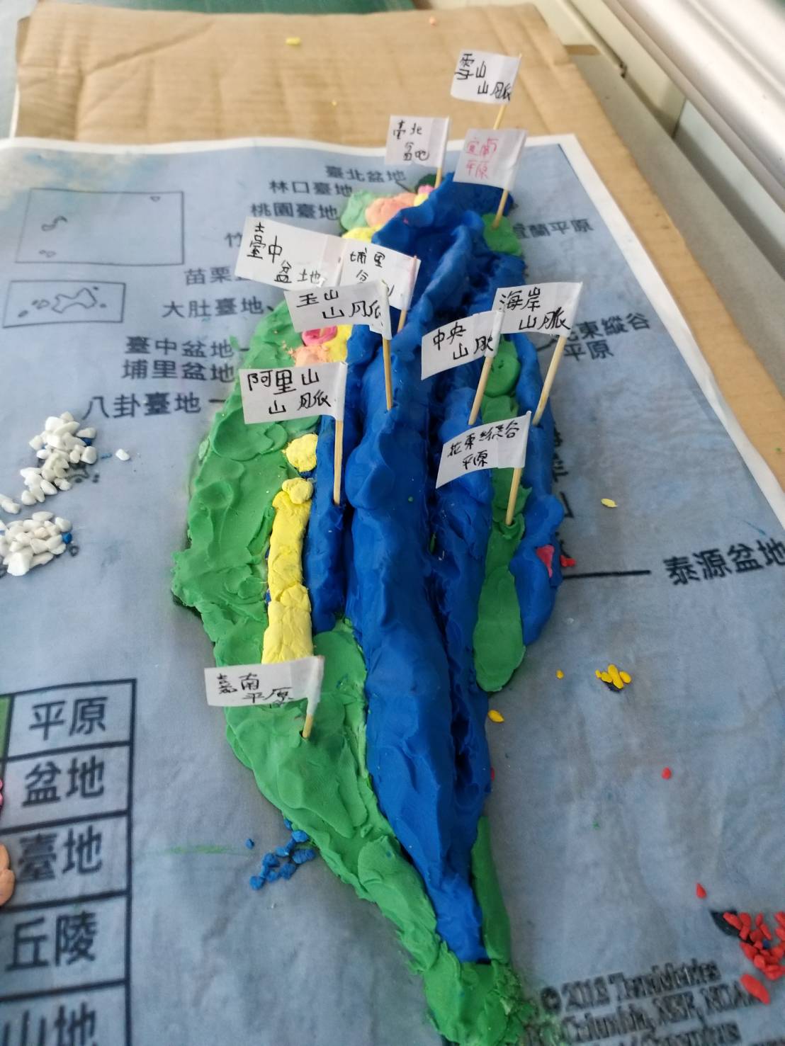 透過黏土實作,讓學生了解台灣山地、丘陵、台地、盆地、平原的分布及地理特性。